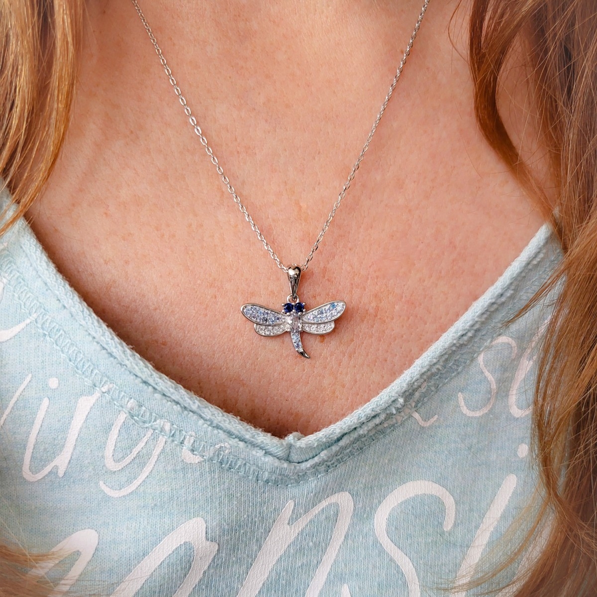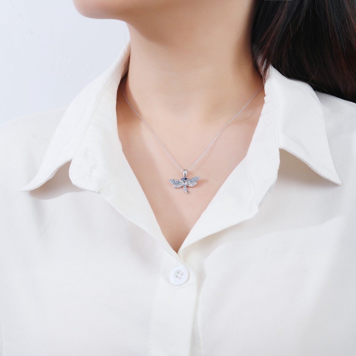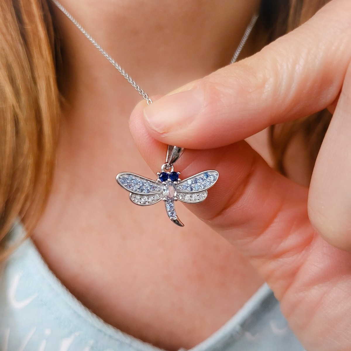 Naszyjnik wykonany z klasycznego łańcuszka o splocie ankier i zawieszki z motywem ważki. Zawieszkę można zdjąć z łańcuszka. Ważka zdobiona jest cyrkoniami w odcieniach niebieskiego. Srebro wykończone na wysoki połysk. Naszyjnik zapinany na federing. Posiada przedłużkę.