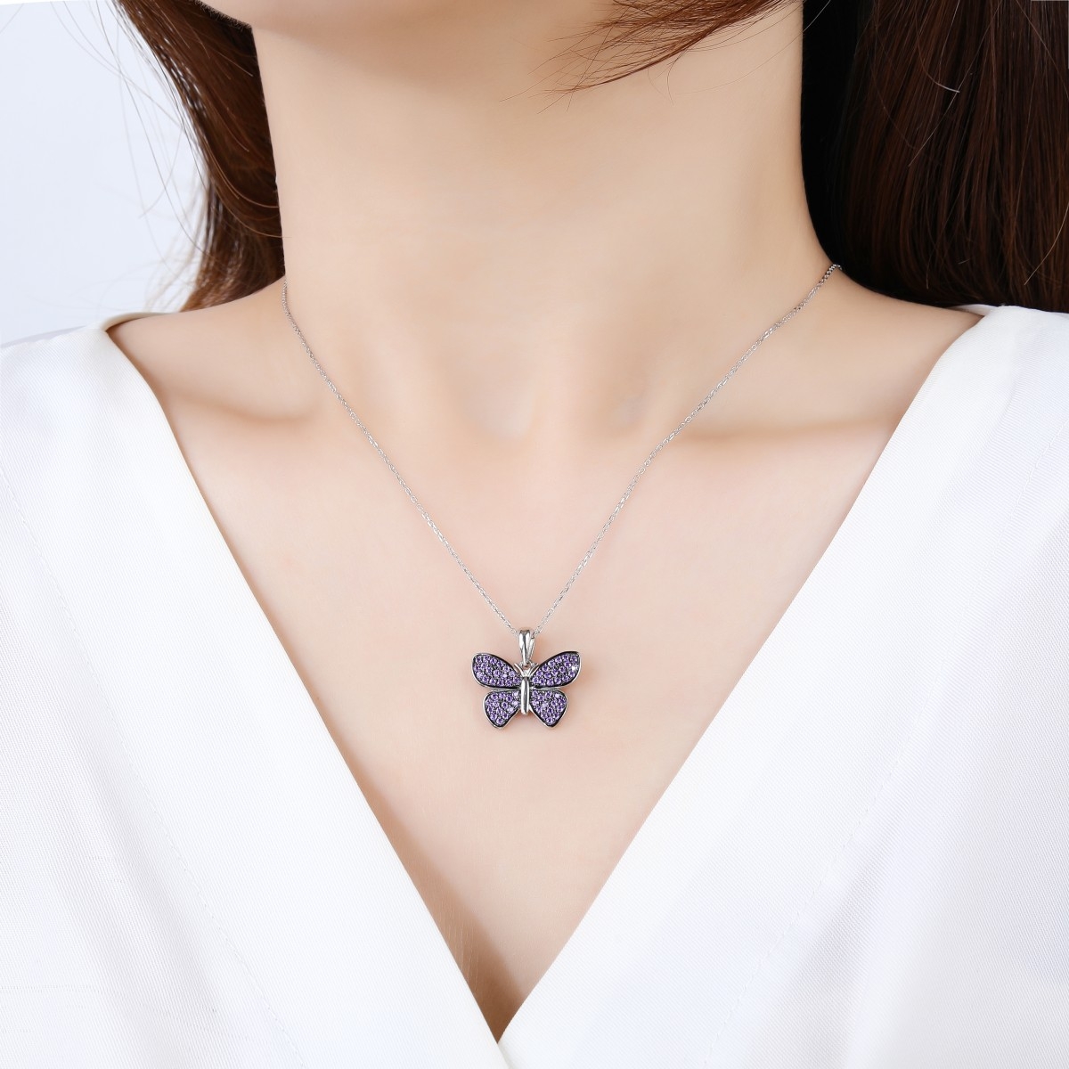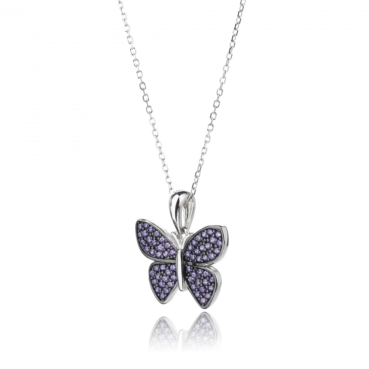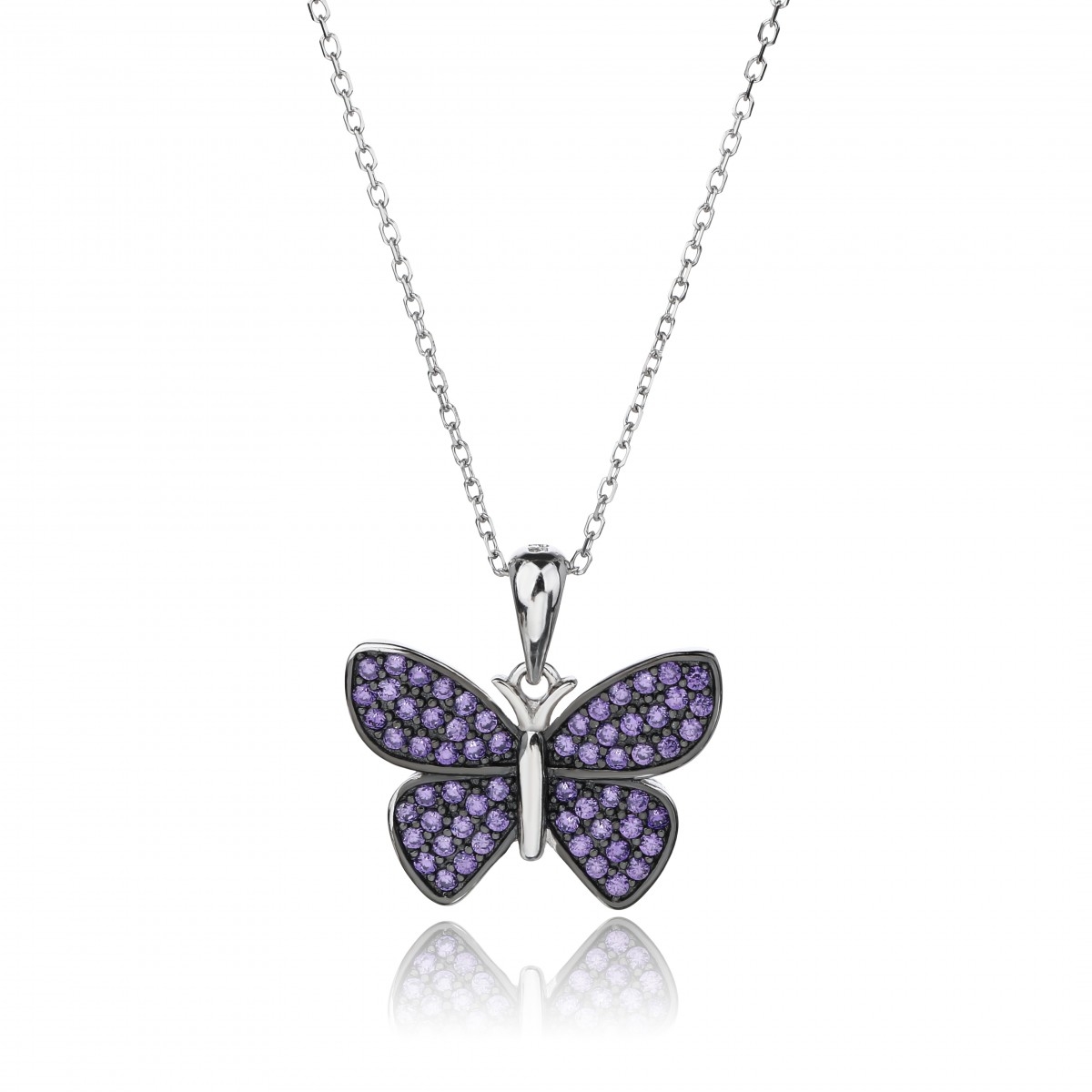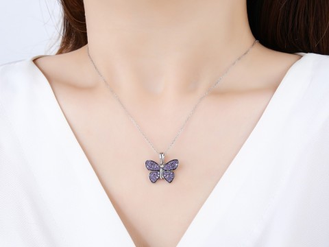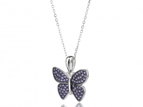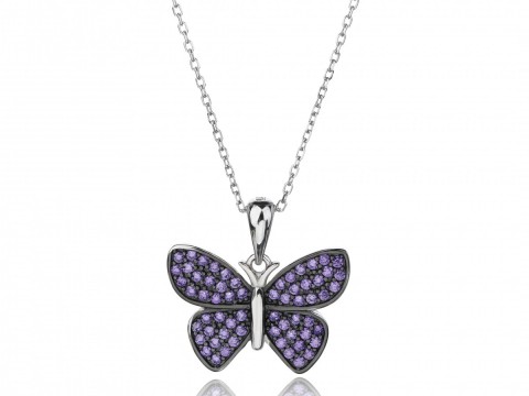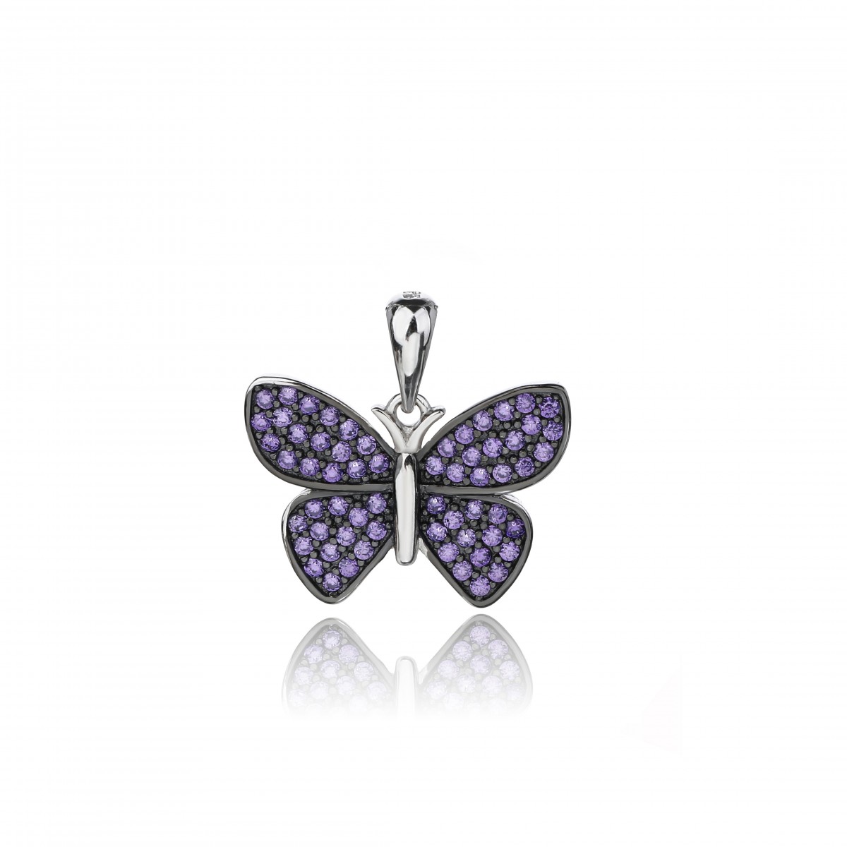 Zawieszka z motywem motyla zdobiona jednostronnie fioletowymi cyrkoniami. Kamienie mocowane metodą microsetting. Srebro uszlachetnione rodem.