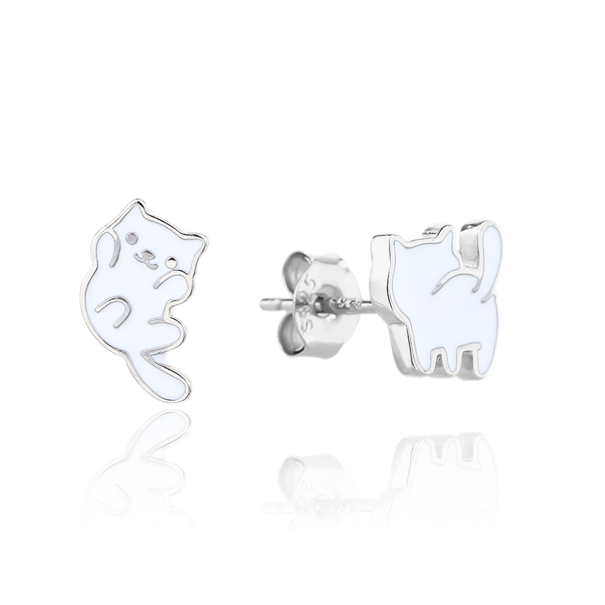 Fantazyjne kolczyki z motywem kota. Jeden kolczyk przedstawia kota z przodu, drugi z tyłu. Rodowane i emaliowane. Zapinane na sztyft.