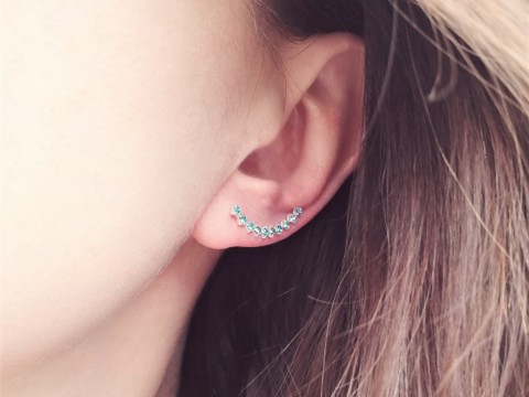 Kolczyki w formie nausznic wykonane ze srebra, zdobione niebieskimi kryształkami cyrkonii. Sztyft nausznic jest cienki i elastyczny, dzięki czemu kolczyki łatwo dopasowują się do małżowiny.