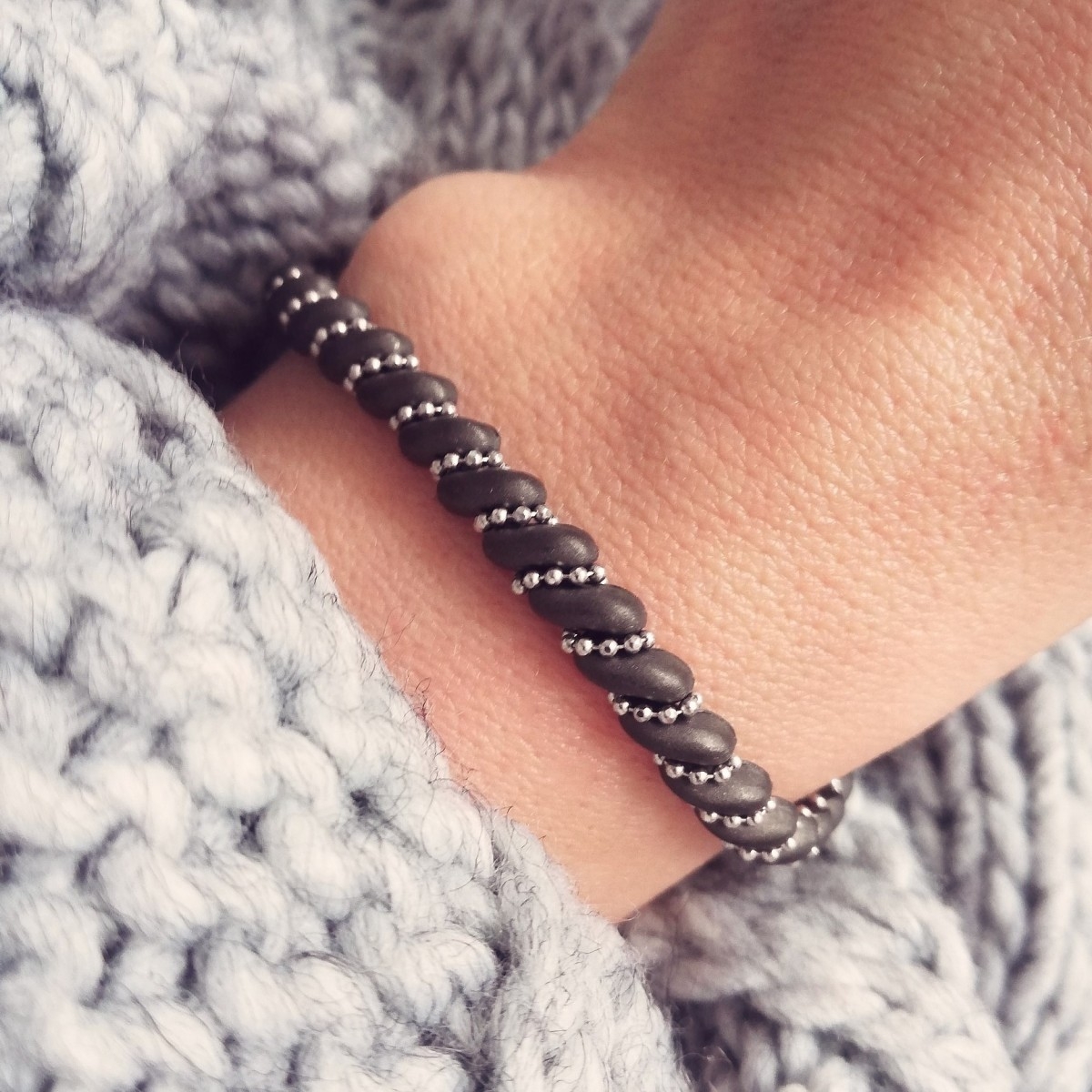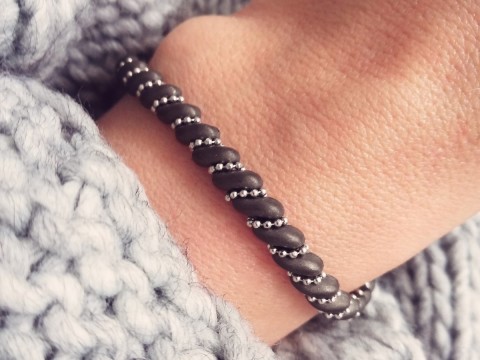 Bransoletka wykonana ze srebrnych, oksydowanych i satynowanych elementów w kolorze czarnym, opleciona cienkim łańcuszkiem kulkowym wykończonym połyskiem. Zapinana na karabińczyk, nie posiada przedłużki.