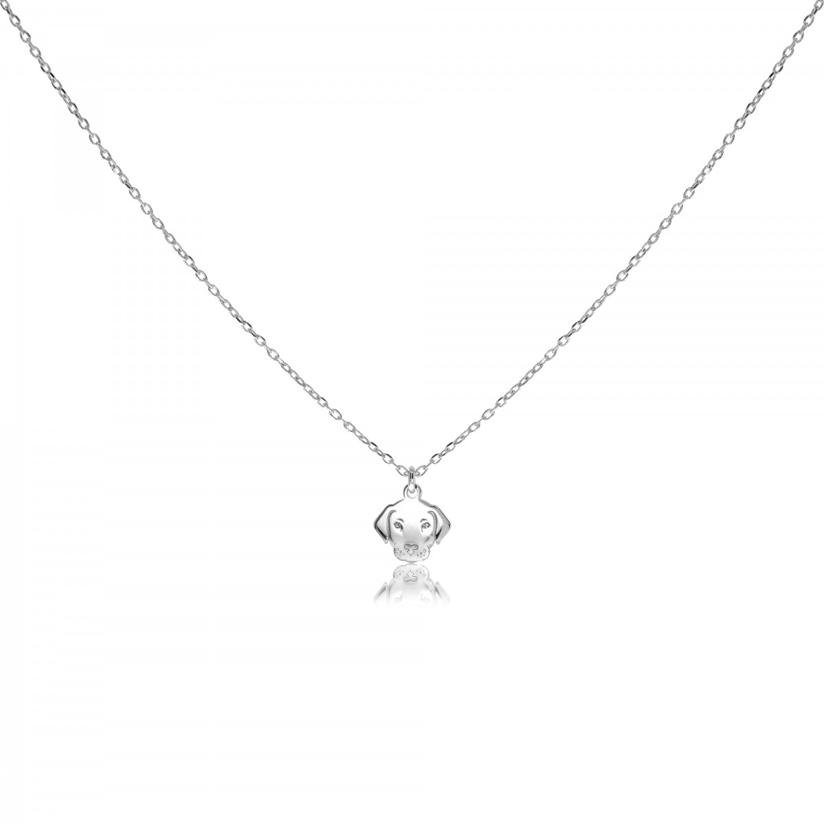 Naszyjnik wykonany z klasycznego łańcuszka o splocie ankier i zawieszki w kształcie głowy pieska. Zapinany na federing z przedłużką. Wykonany z rodowanego srebra, wykończonego połyskiem.