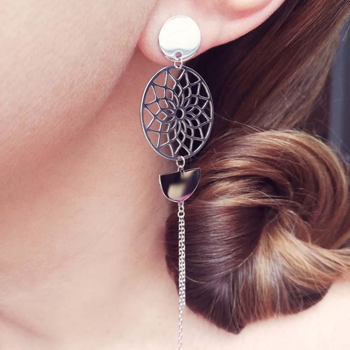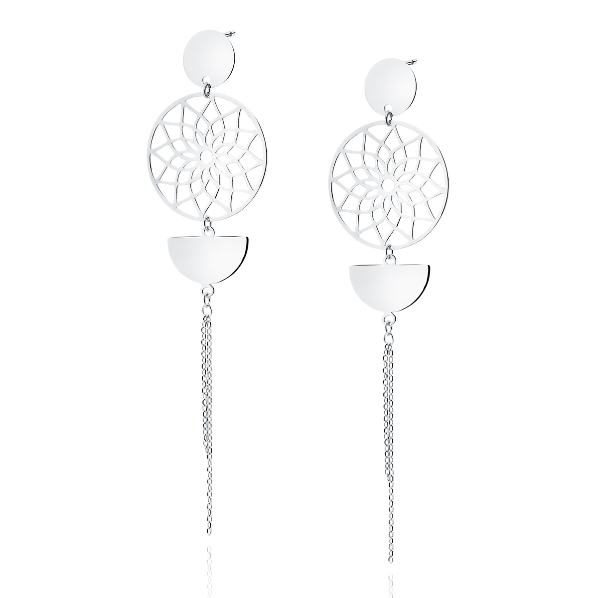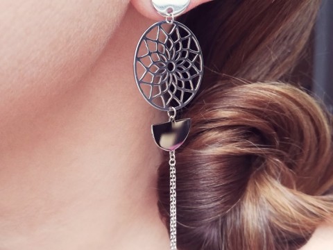 Srebrne, długie kolczyki zdobione ażurową mandalą, podwójnym łańcuszkiem oraz elementami w kształcie koła i połkola. Srebro uszlachetnione rodem i wykończone wysokim połyskiem.