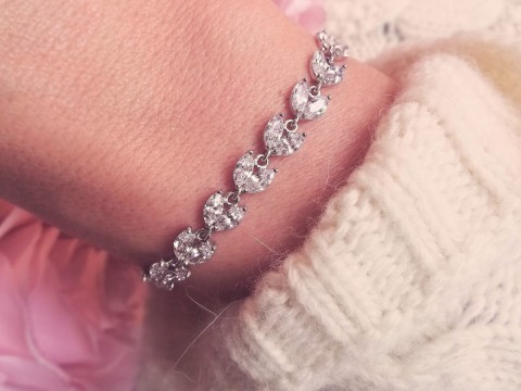 Bransoletka wykonana z połączonych listków zdobionych białą, pięknie połyskującą cyrkonią. Uszlachetniona rodem. Zapinana na karabińczyk. Posiada przedłużkę.