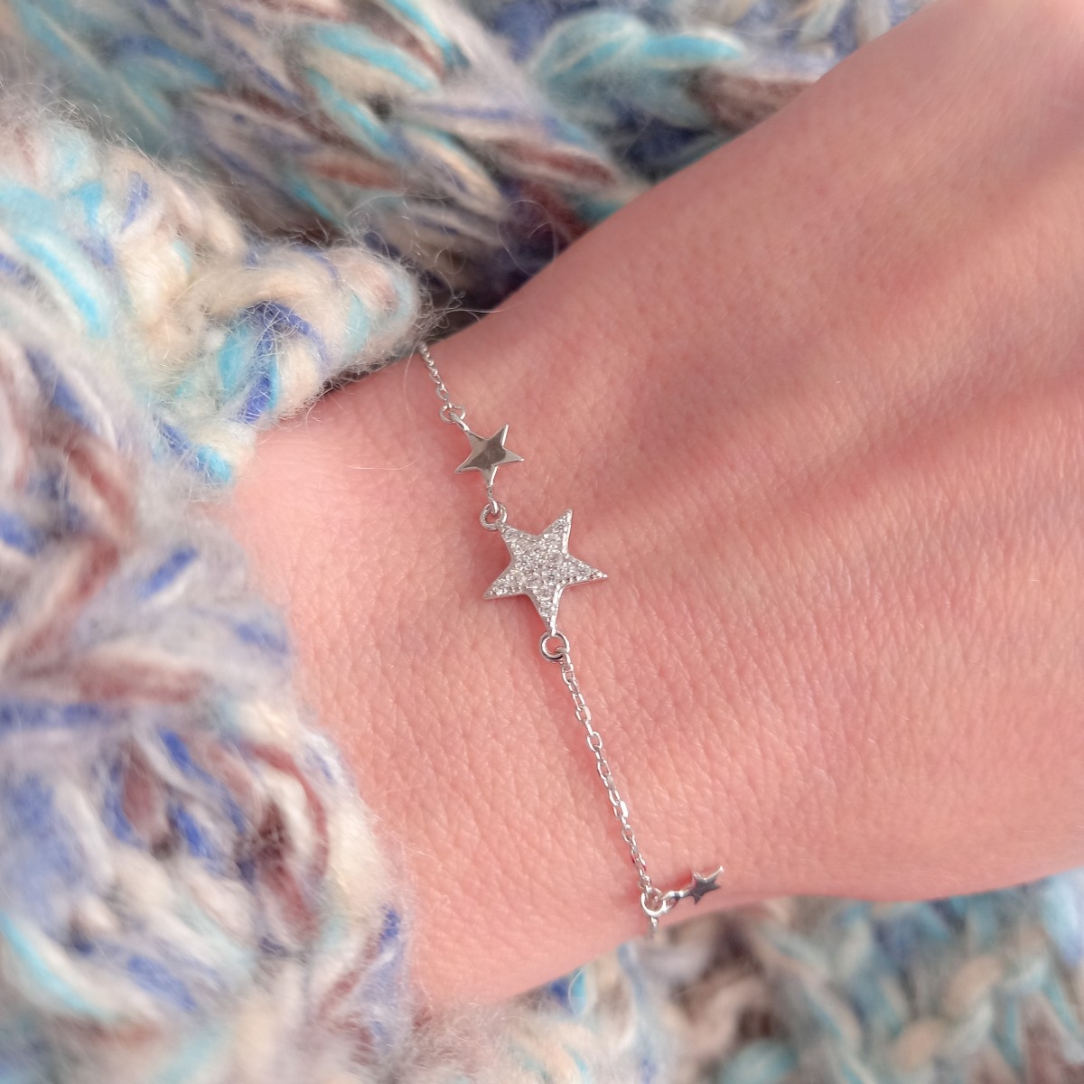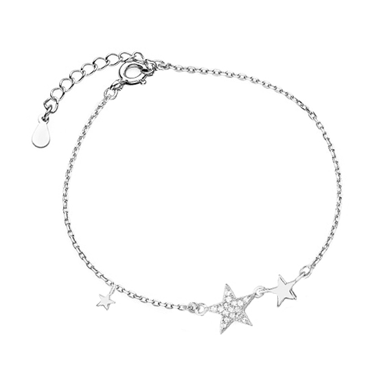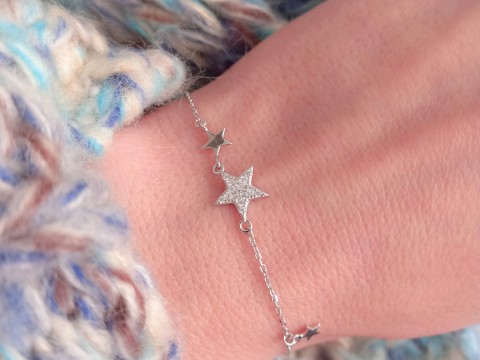 Bransoletka wykonana z łańcuszka typu ankier i trzech srebrnych gwiazdek, w tym jednej zdobionej cyrkoniami. Srebrne elementy uszlachetnione są rodem, by dłużej zachowały jasną barwę, blask i były odporniejsze na uszkodzenia. Zapinana na federing. Posiada srebrną przedłużkę.