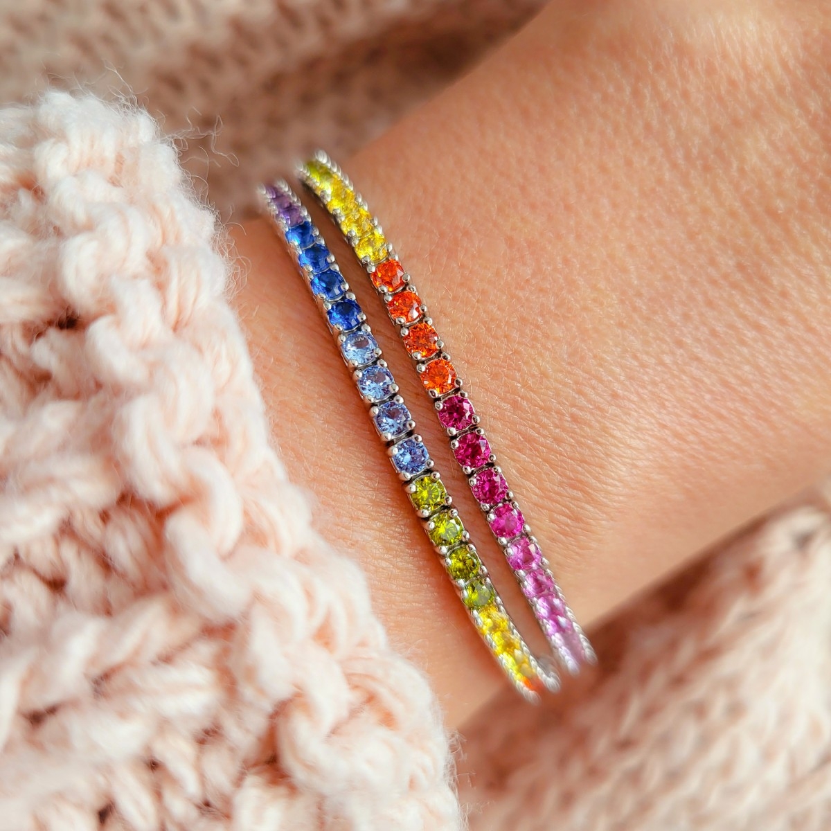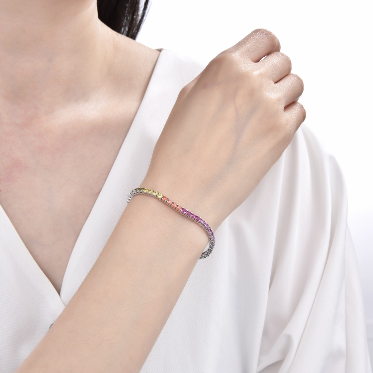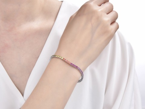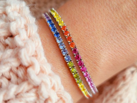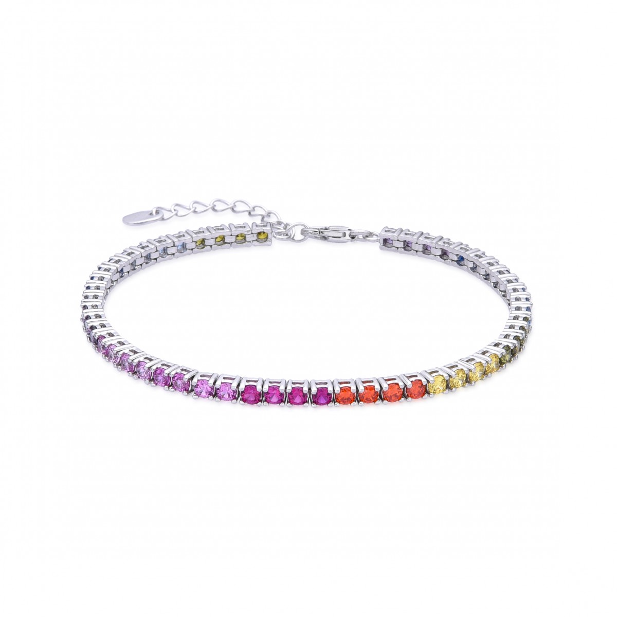 Rodowana bransoletka tenisowa wykonana z kostki, zdobiona kolorowymi cyrkoniami. Wykończona połyskiem. Zapinana na karabińczyk, posiada przedłużkę.