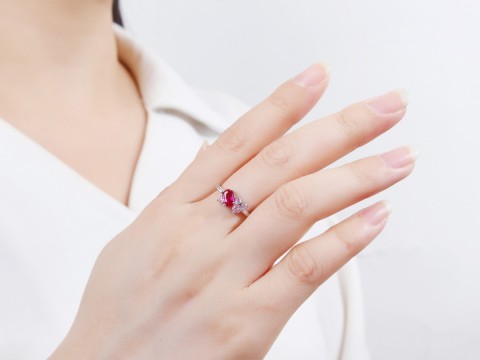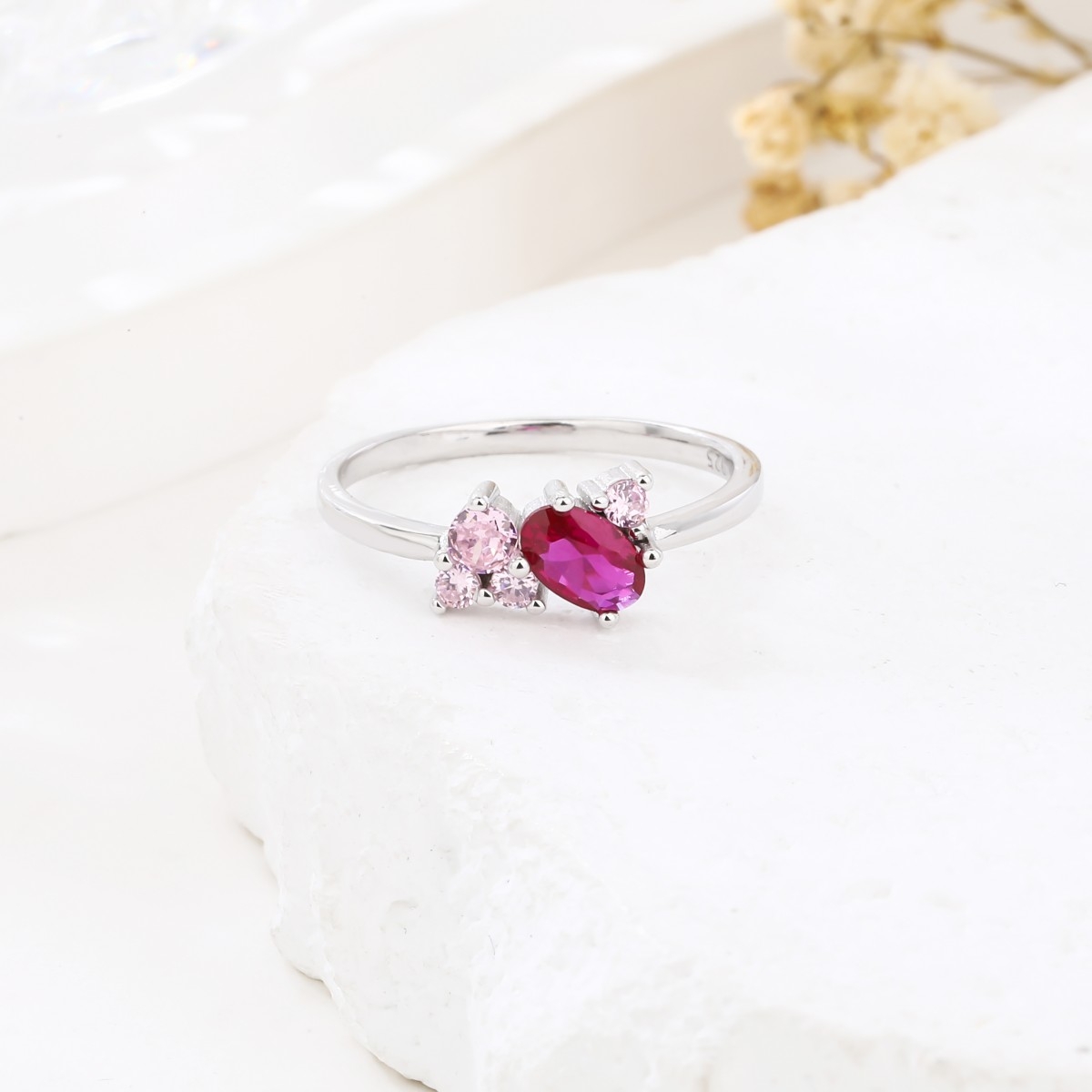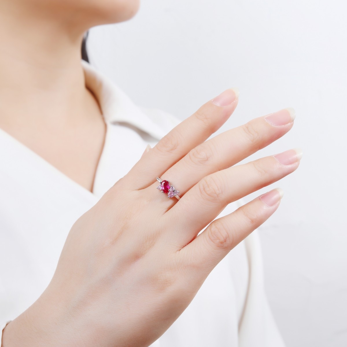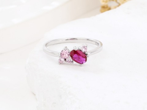 Rodowany pierścionek z rubinową cyrkonią o kształcie owalu i mniejszymi okrągłymi w jasnoróżowym kolorze. Srebro wykończone połyskiem.