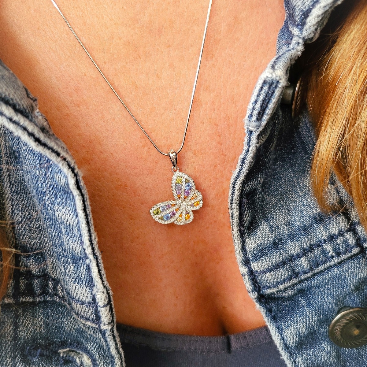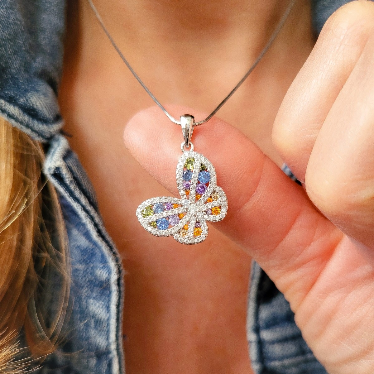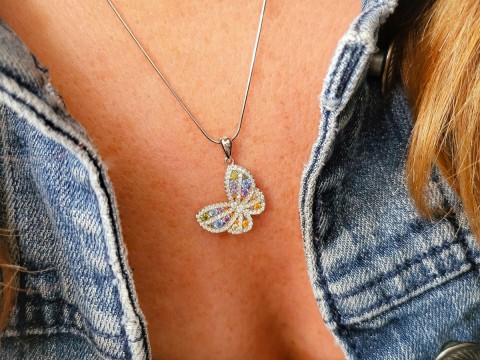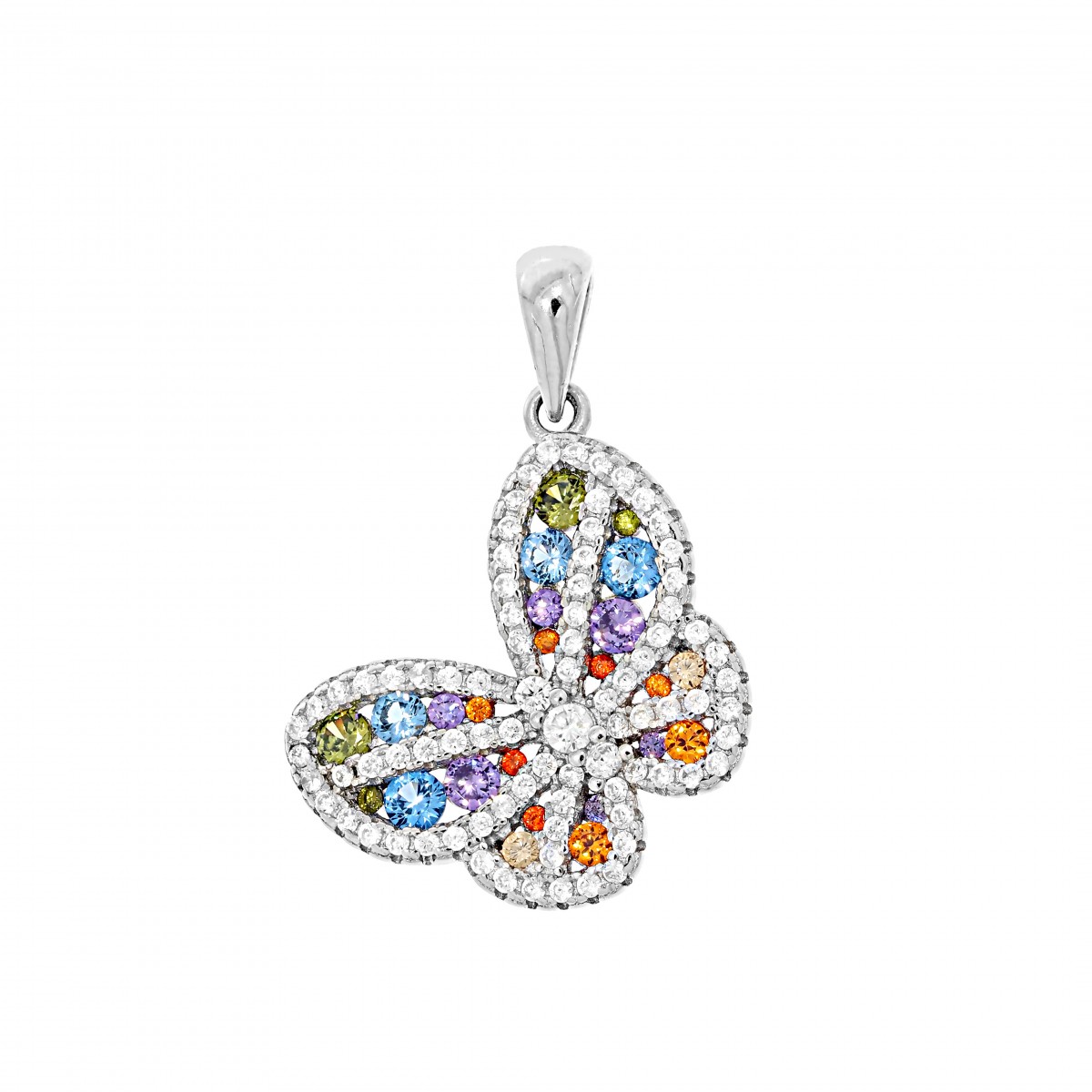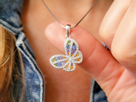 Rodowana zawieszka z motylem wysadzanym białymi i kolorowymi cyrkoniami. Uszlachetniona rodem i wykończona połyskiem.