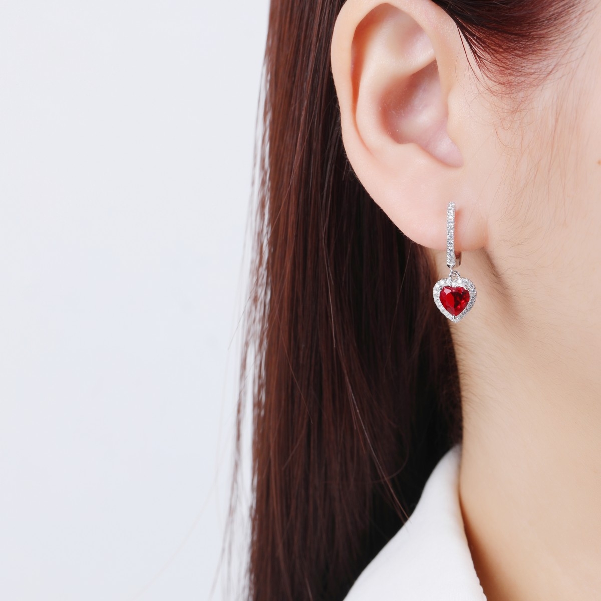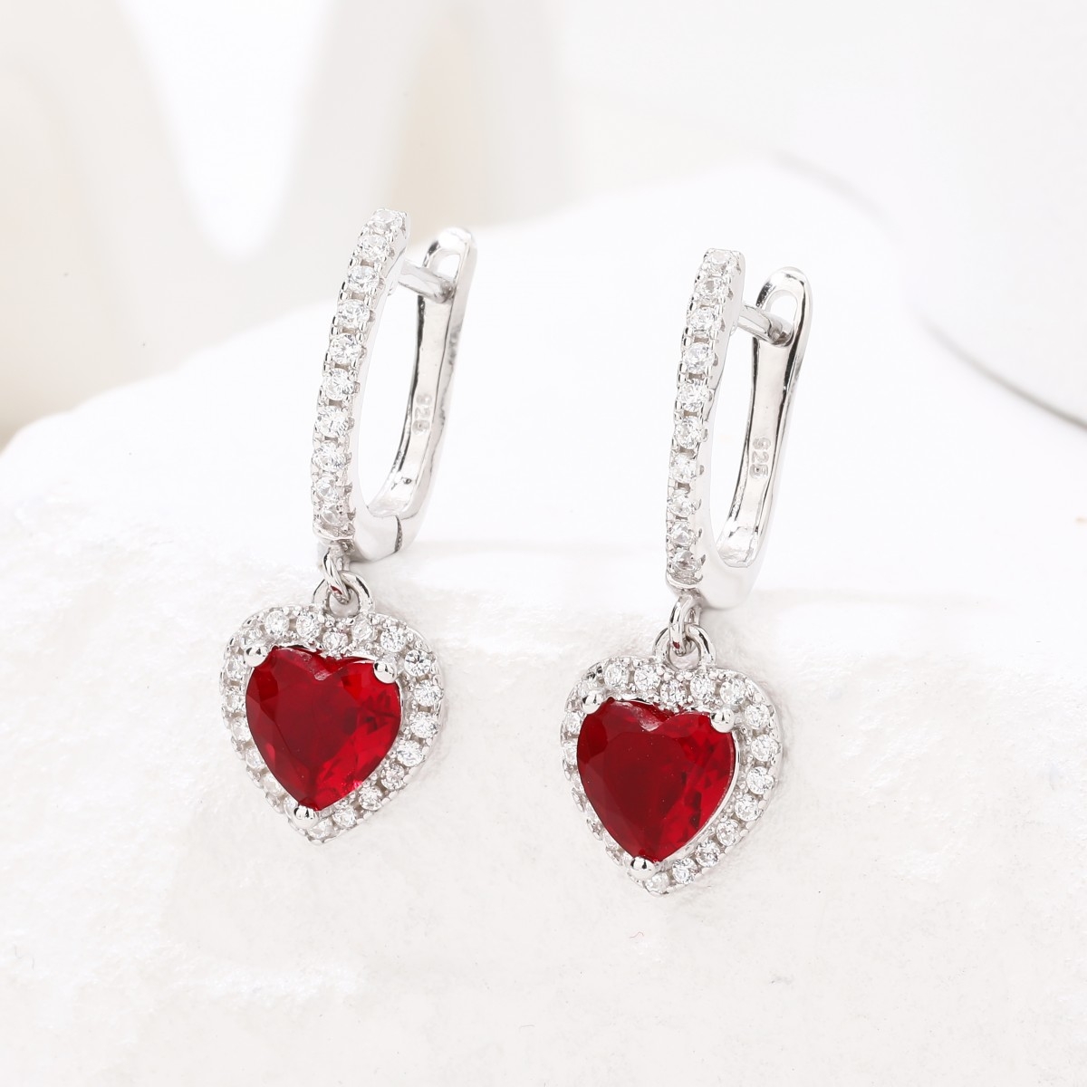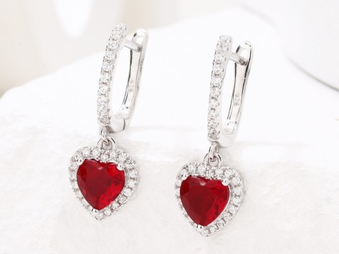 Rodowane kolczyki na angielskim zapięciu z zawieszką z czerwonym serduszkiem. Serce wykonane jest z czerwonej cyrkonii, otoczone białymi drobnymi cyrkoniami. Cyrkonie zdobią również zapięcie. Srebro wykończone wysokim połyskiem.