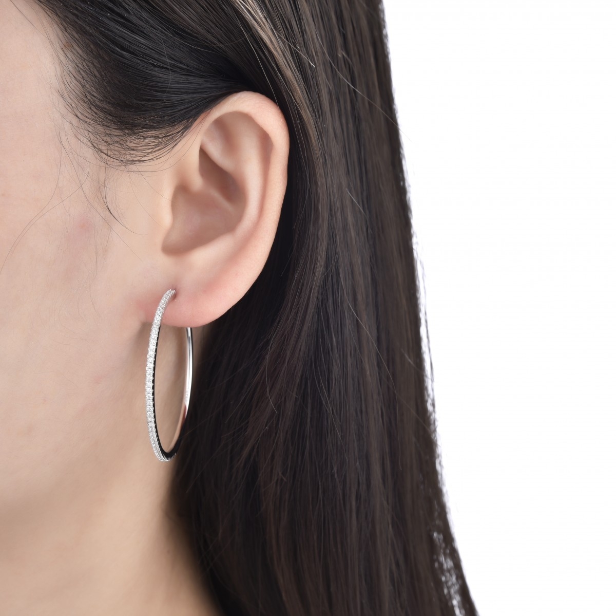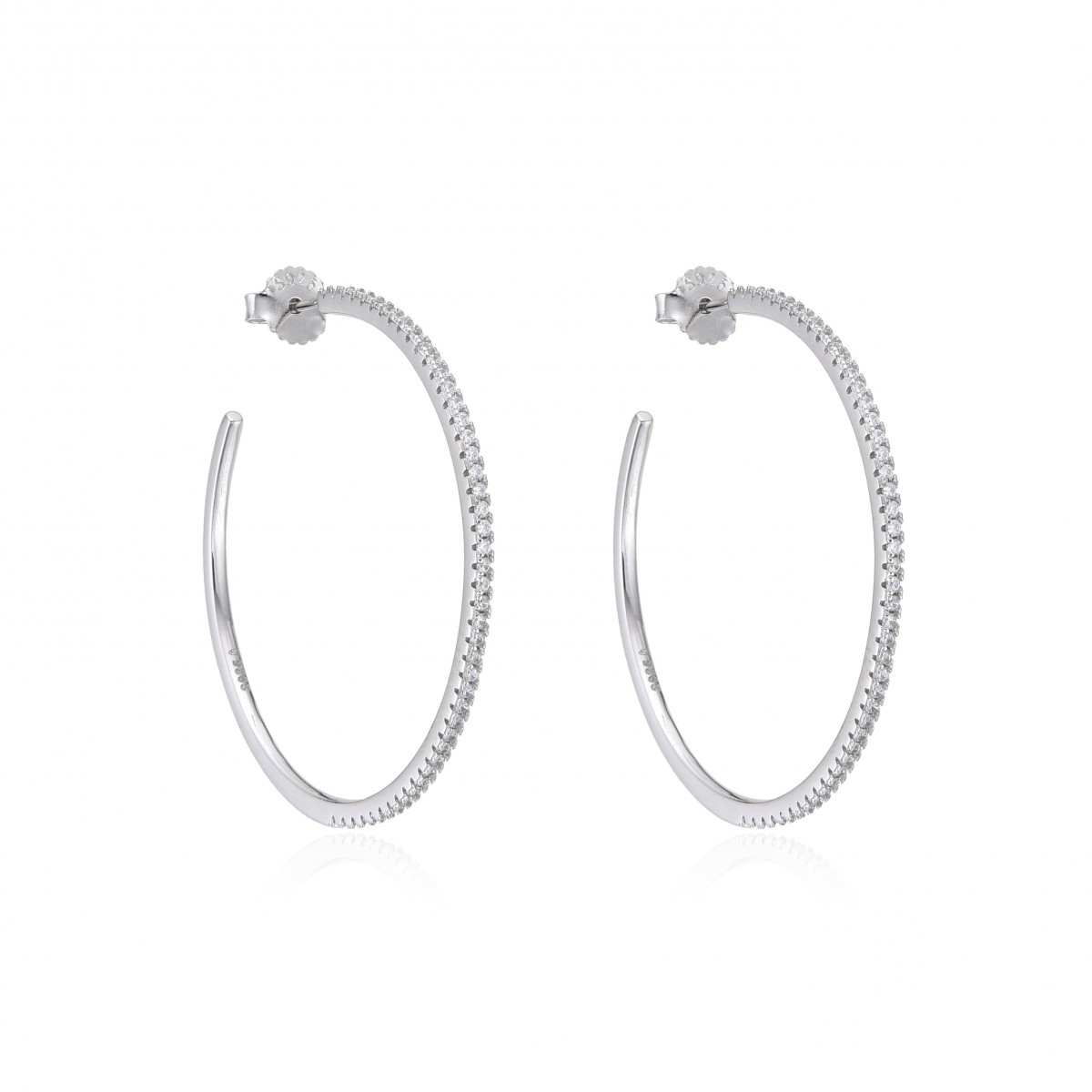 Rodowane kolczyki w kształcie koła zdobione cyrkoniami. Zapinane na sztyft. Wykończone wysokim połyskiem.