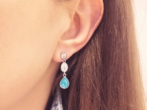 Kolczyki z białą cyrkonią na sztyfcie i zawieszką z dwóch kamieni syntetycznych w białym i niebieskim kolorze. Uszlachetnione rodem, by dłużej zachowały jasną barwę, blask i były odporniejsze na uszkodzenia.