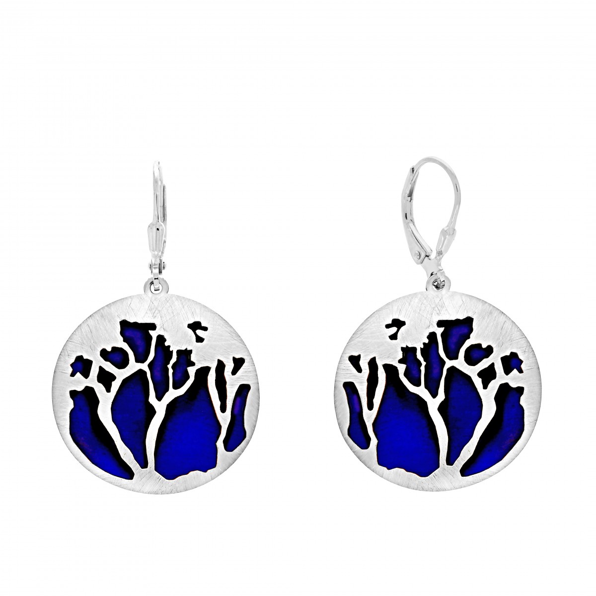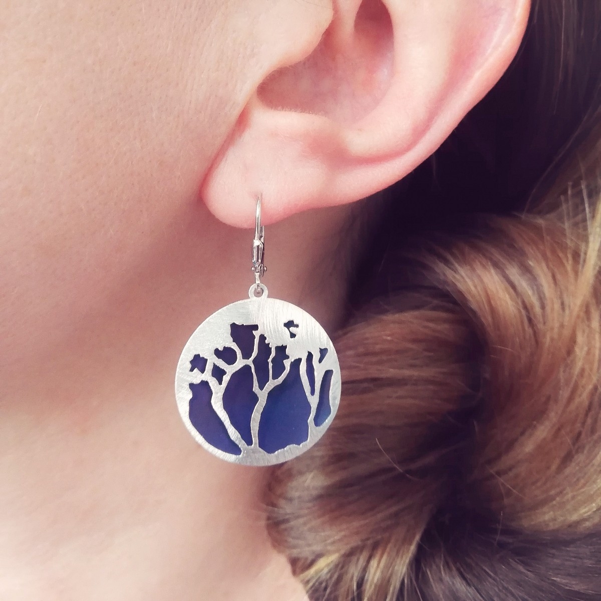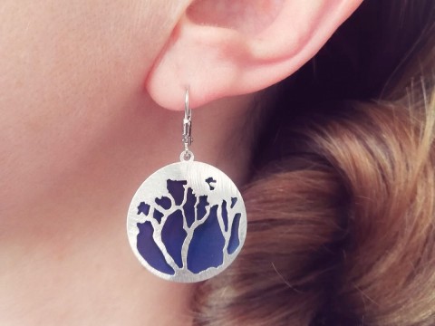 Kolczyki z okrągłą zawieszką o trójwymiarowym obrazie drzew na tle niebieskiego nieba. Delikatnie pękate. Wykonane z rodowanego srebra i tytanu (wytrzymałego, lekkiego, odpornego na korozję i hypoalergicznego metalu). Ręcznie szczotkowane. Lekkie, komfortowe w noszeniu.