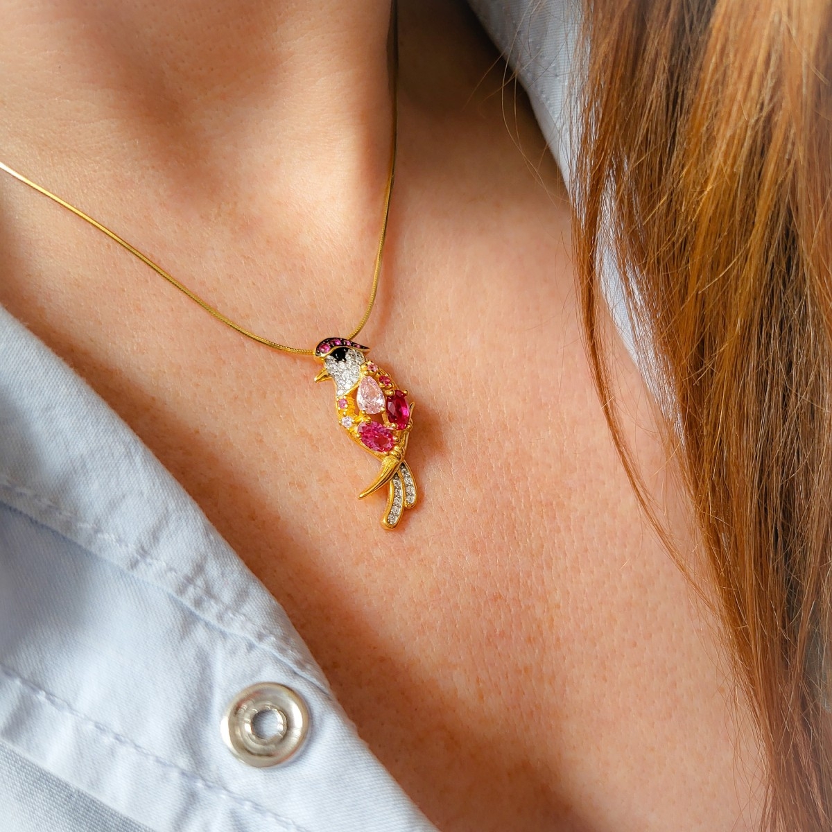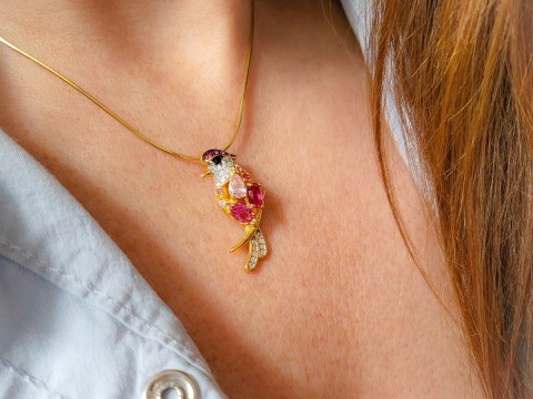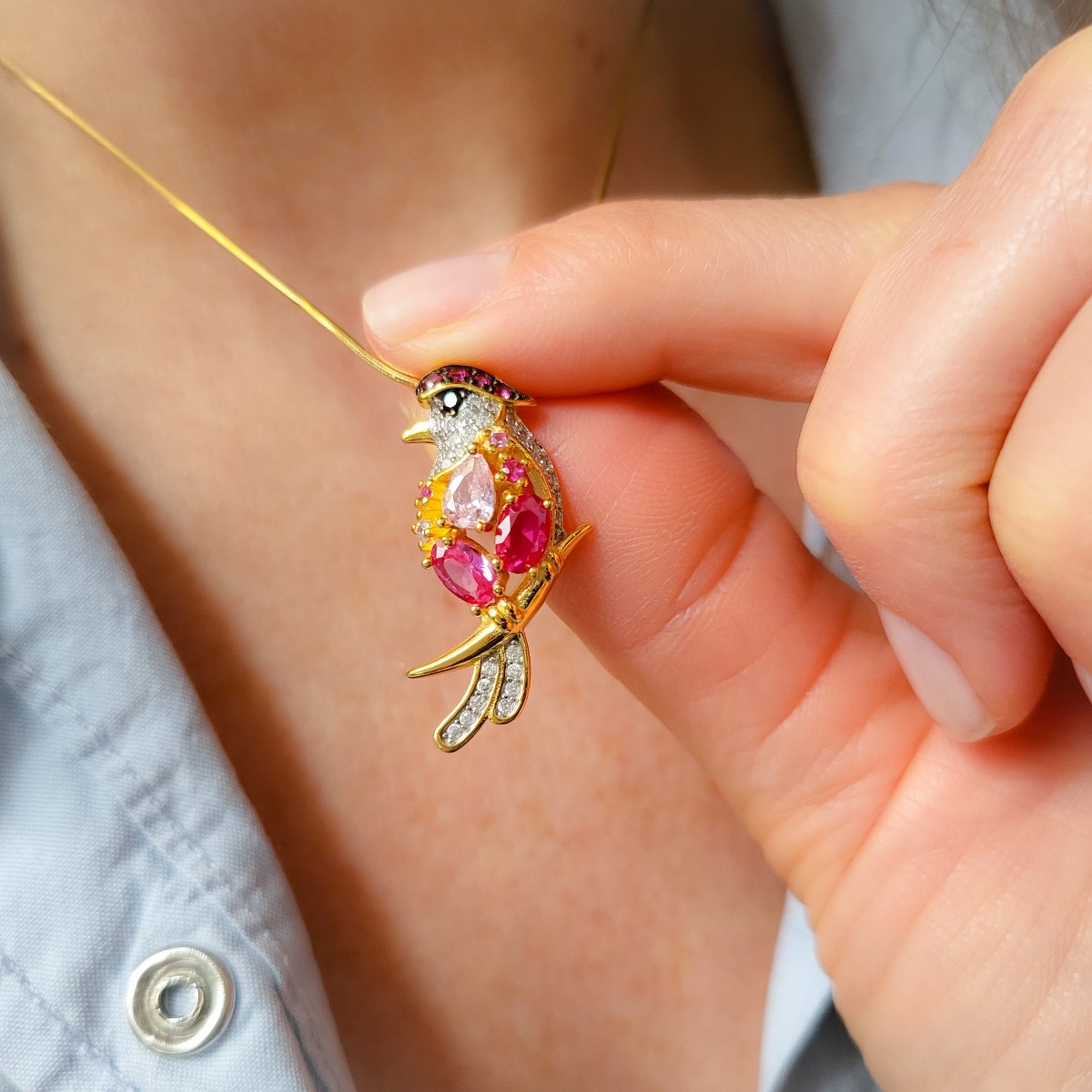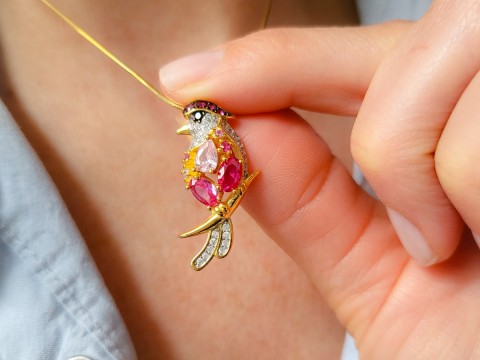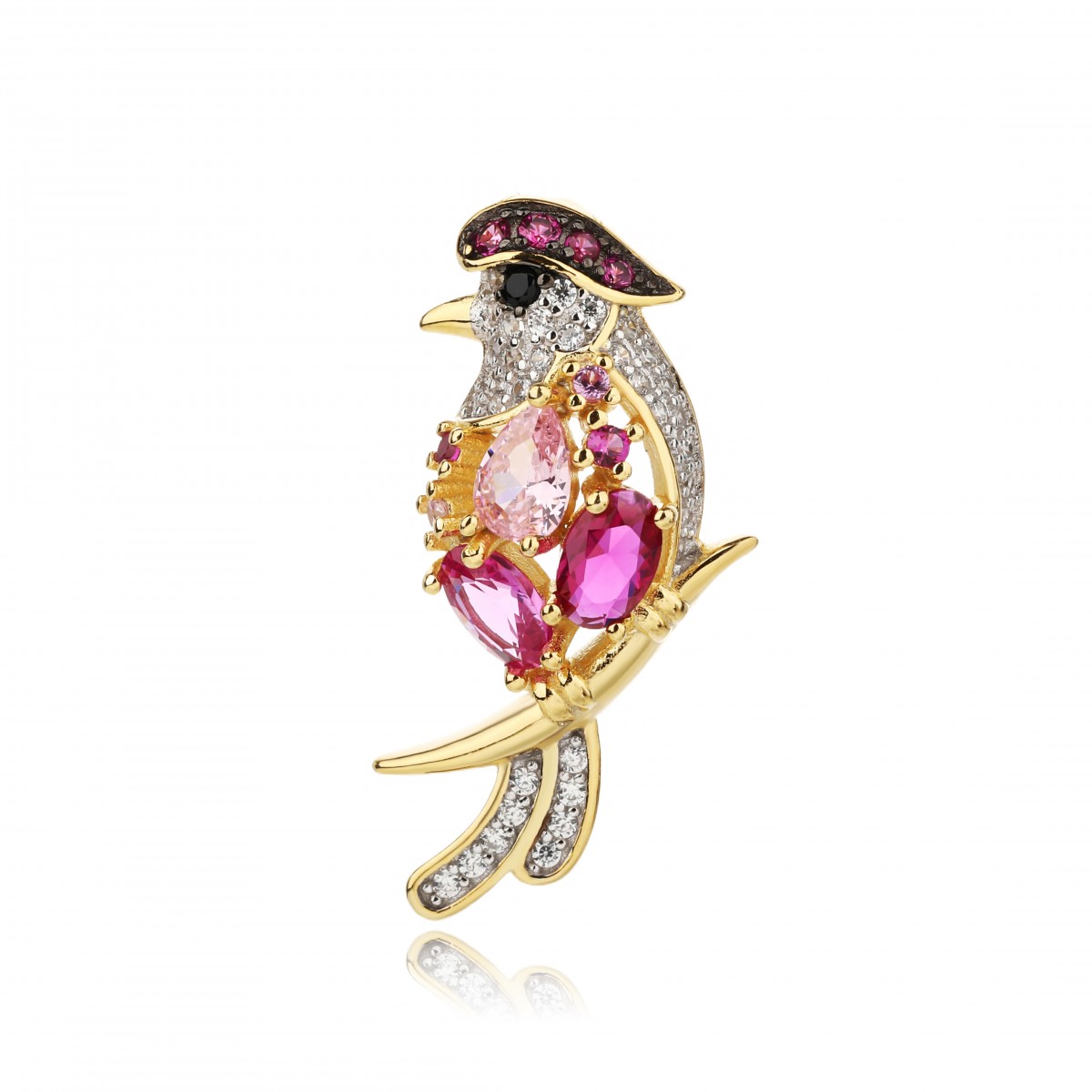 Pozłacany wisiorek z motywem ptaszka wysadzany pięknie połyskującymi cyrkoniami w odcieniach różu. Powierzchnia wykończona wysokim połyskiem.
