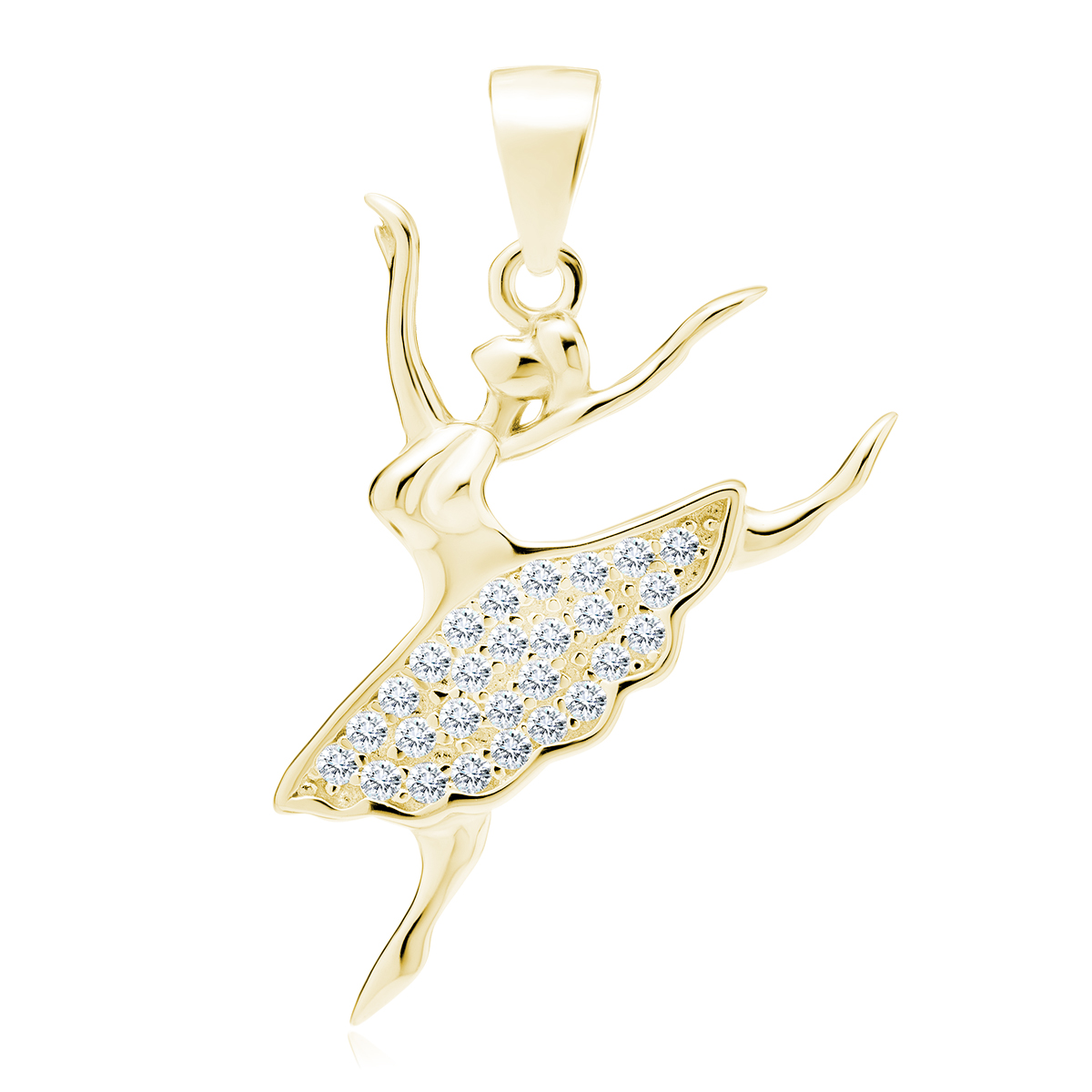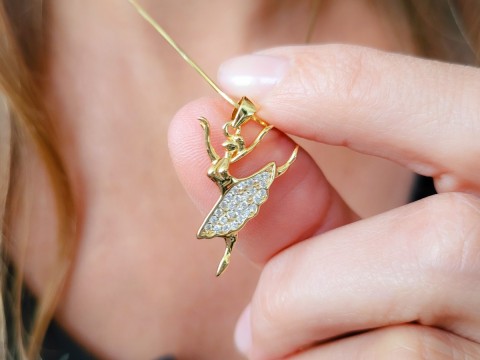 Zawieszka z motywem tańczącej baletnicy. Wykonana ze srebra, jednostronnie zdobiona białymi cyrkoniami. Wykończona połyskiem.