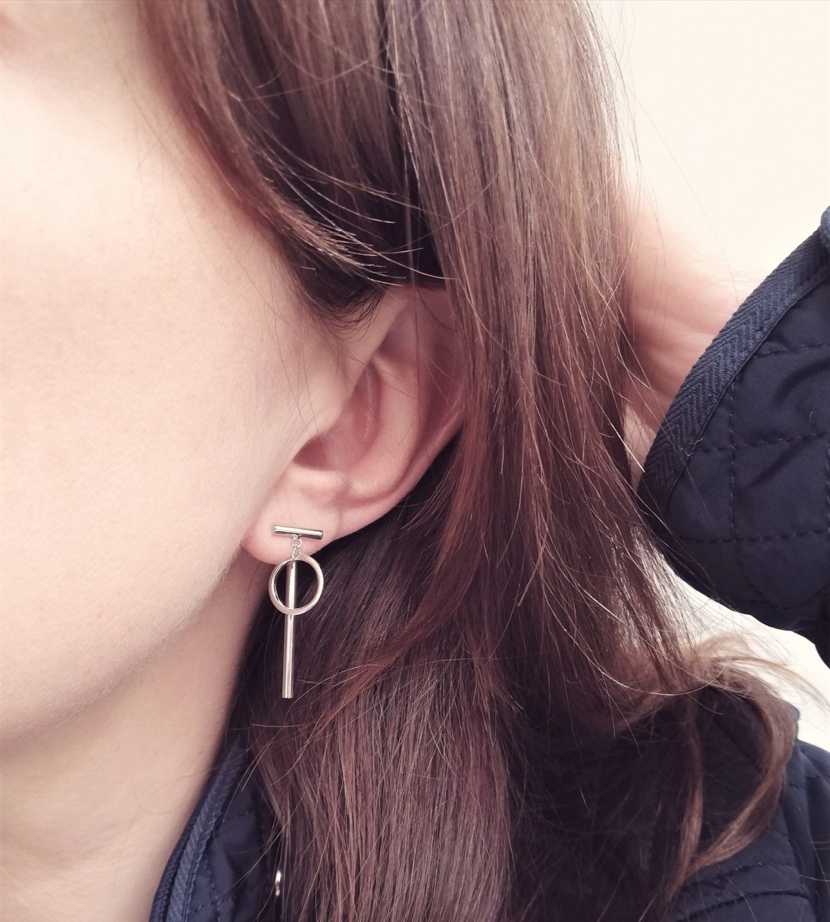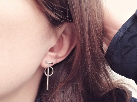 Ciekawe w formie kolczyki wykonane z dwóch elementów mocowanych na sztyfcie (kółeczko) i na zapięciu (patyczek). Wykonane ze złoconego srebra.