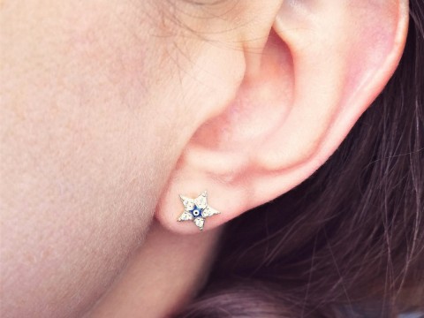 Kolczyki z motywem gwiazdki. Zdobione białymi cyrkoniami i małą gwiazdeczką wypełnioną niebiesko-granatową emalią.