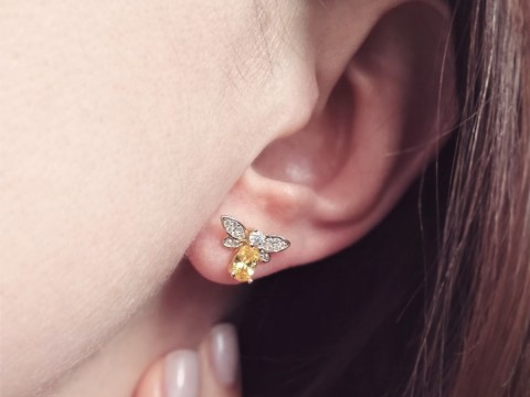 Kolczyki z motywem pszczółki. Zdobione centralnie dużą żółtą cyrkonią (odwłok) i białymi cyrkoniami na głowie i skrzydełkach.