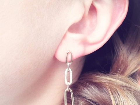 Srebrne kolczyki w formie pięciu ogniwek łańcuszka, który jeden zdobiony jest cyrkoniami.