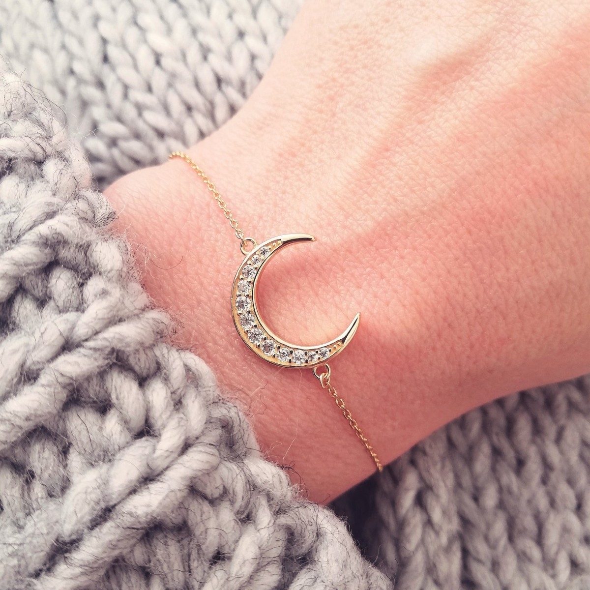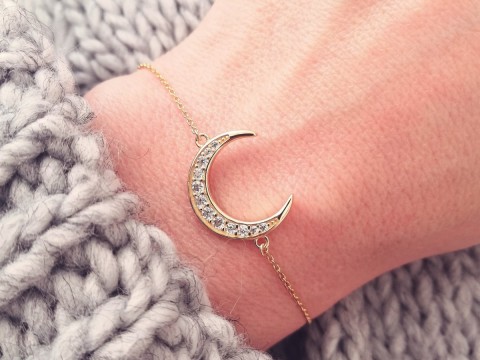 Bransoletka wykonana z łańcuszka o splocie ankier, zdobiona elementem w postaci półksiężyca z cyrkoniami. Zapinana na federing.