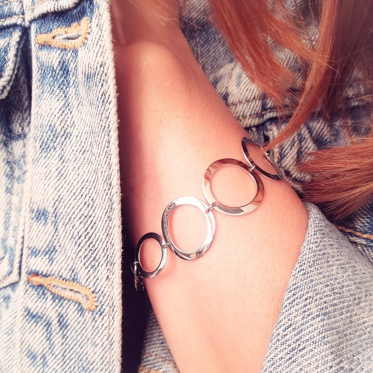 Bransoletka wykonana z kółek o dwóch średnicach: 14 i 18 mm. Zapinana na karabińczyk. Posiada przedłużkę. Srebro wykończone wysokim połyskiem.
