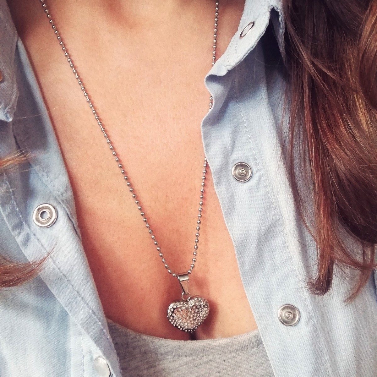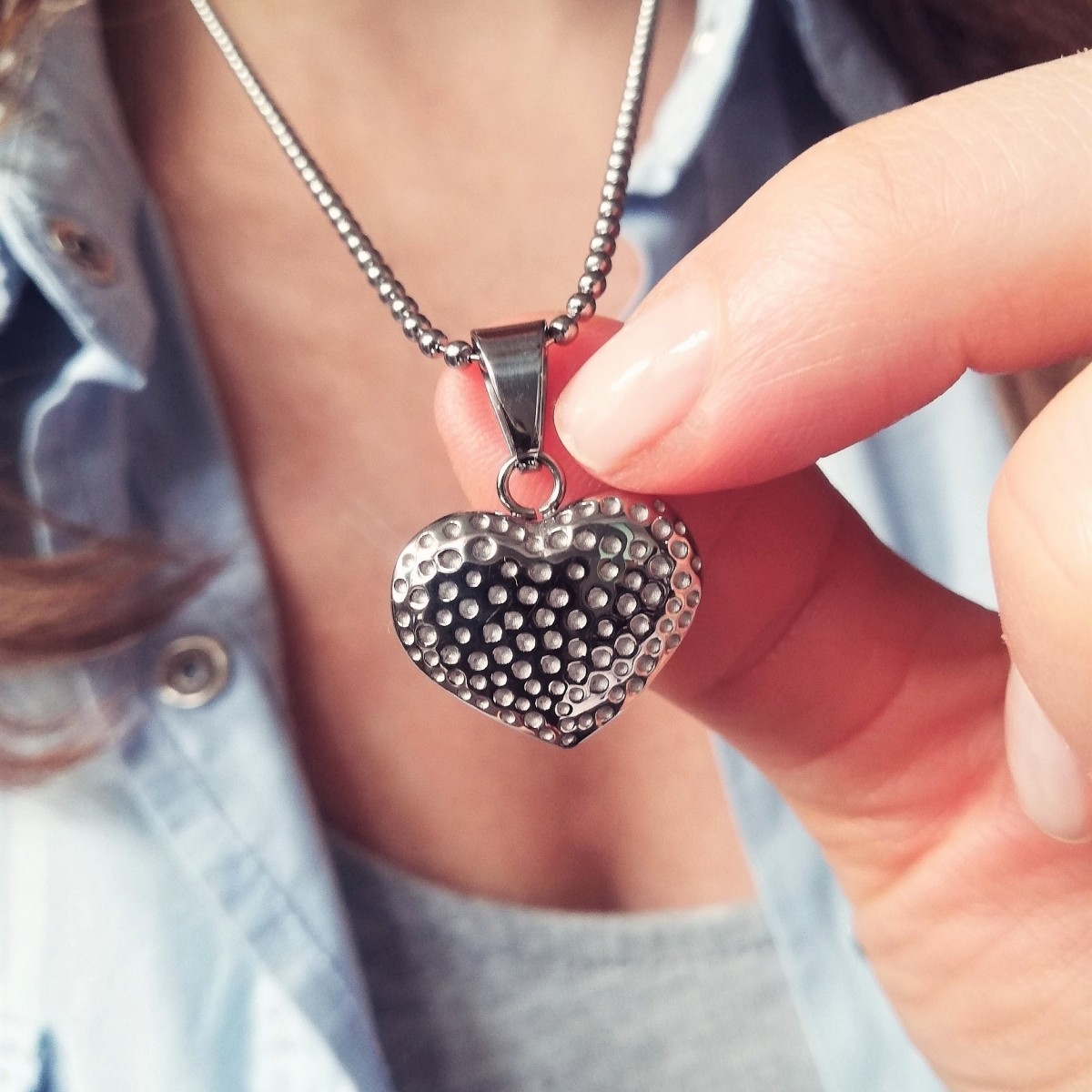 Naszyjnik wykonany z kulkowego łańcuszka typu bulion zdobiony zawieszką w kształcie serca obustronnie zdobionego wytłaczanym wzorem. Hipoalergiczny, o powierzchni odpornej na zarysowanie, utlenienie, przebarwienie i korozję.