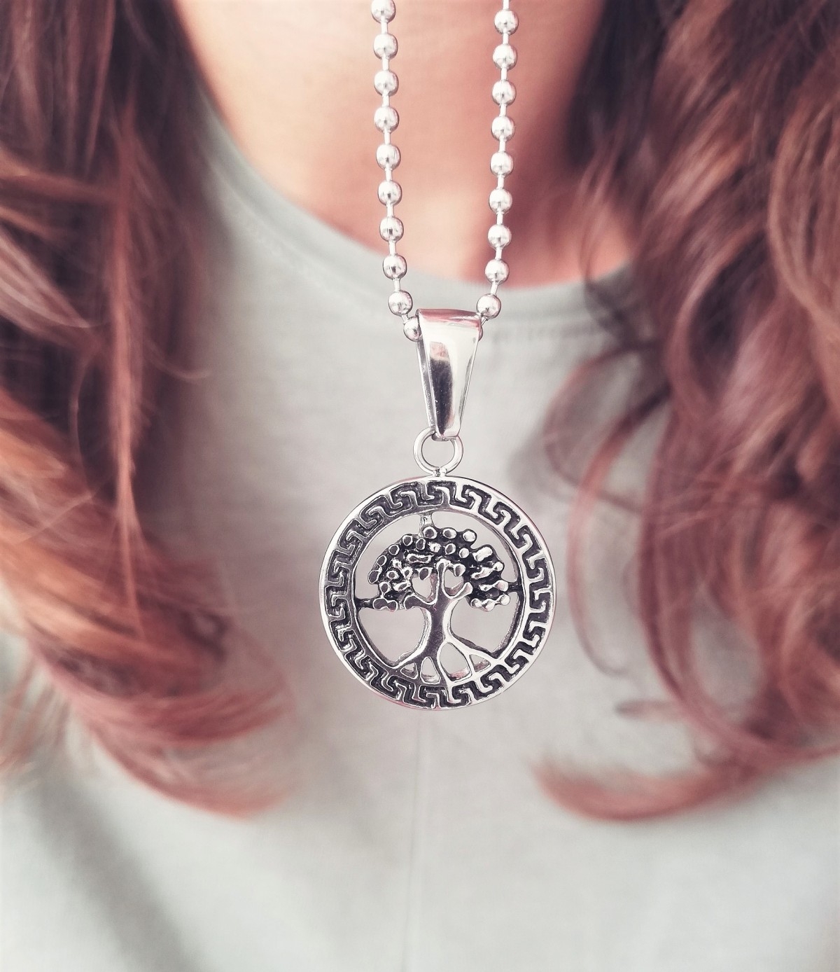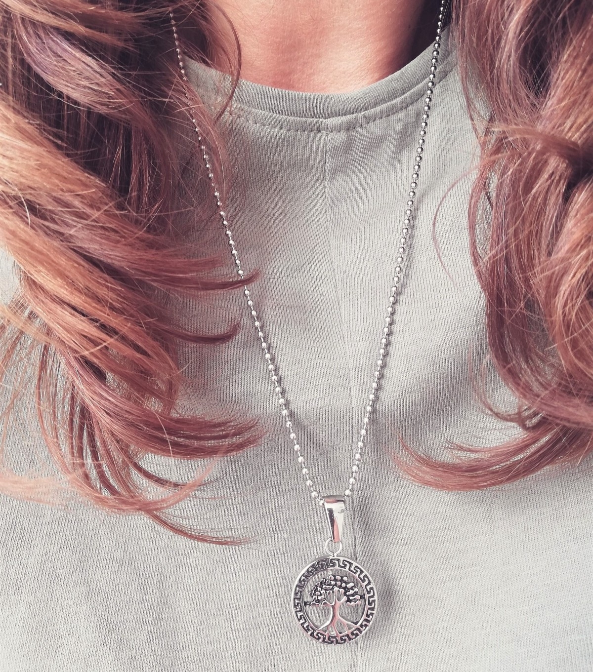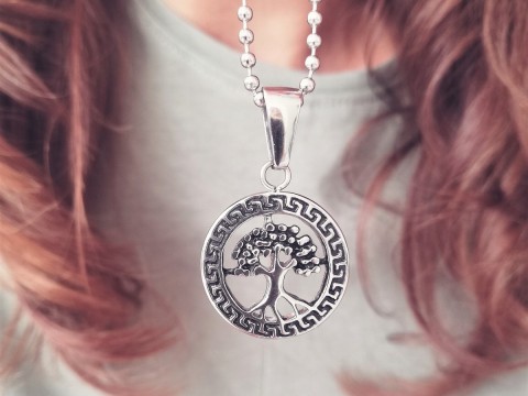 Naszyjnik wykonany z kulkowego łańcuszka typu bulion zdobiony zawieszką w kształcie drzewa życia. Hipoalergiczny, o powierzchni odpornej na zarysowanie, utlenienie, przebarwienie i korozję.