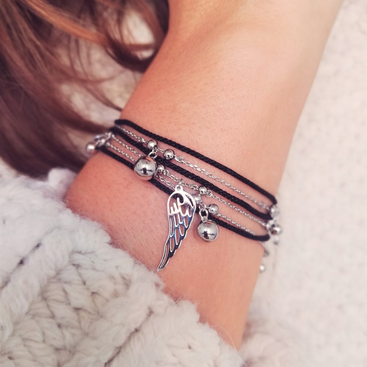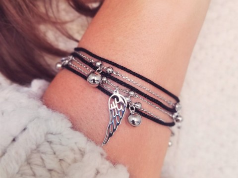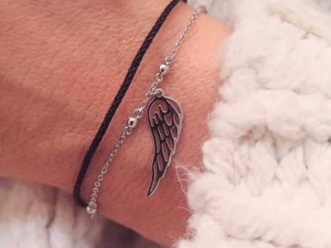 Bransoletka wykonana ze srebrnego łańcuszka typu ankier, czarnego sznurka, ażurowej zawieszki w kształcie skrzydła anioła i dwóch zawieszek z cyrkonii. Zawieszki posiadają separatory w kształcie kuleczek. Zapinana na federing. Posiada srebrną przedłużkę.