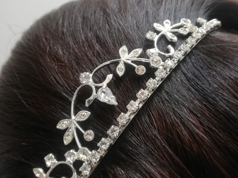 Elegancki diadem w klasycznej formie. Wykonany z metalowej, posrebrzanej opaski i tiary z kryształowych oczek o różnej wielkości. Zabezpieczony przed utlenianiem, dzięki czemu nie zmienia barwy. Nie zawiera niklu.