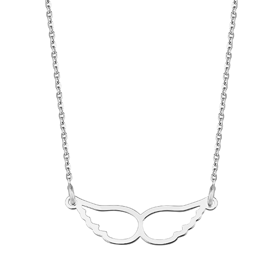 Naszyjnik typu celebrytka wykonany z klasycznego łańcuszka o splocie ankier zdobiony płaskim motywem skrzydeł anioła. Uszlachetniony rodem, by dłużej zachował jasną barwę, blask i był odporniejszy na uszkodzenia. Zapinany na federing.