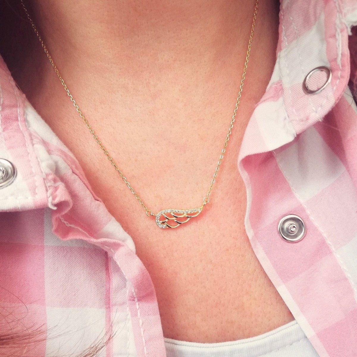 Naszyjnik ze złoconego srebra wykonany z klasycznego łańcuszka o splocie ankier, zdobiony skrzydłem anioła z cyrkoniami. Zapinany na federing.