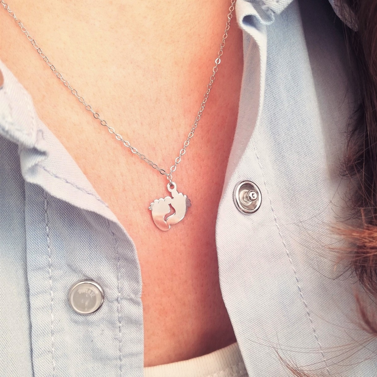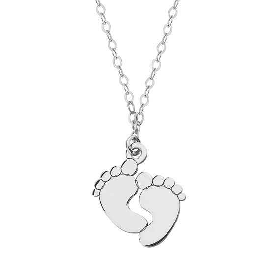 Naszyjnik typu celebrytka wykonany z klasycznego łańcuszka o splocie ankier zdobiony motywem stópek. Uszlachetniony rodem, by dłużej zachował jasną barwę, blask i był odporniejszy na uszkodzenia. Zapinany na federing.