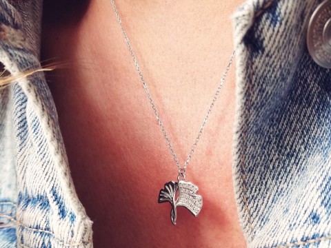 Naszyjnik z zawieszką z motywem liścia miłorzębu japońskiego (łac. gingko biloba). Zdobiony białymi cyrkoniami. Srebro rodowane. Naszyjnik zapinany na federing. Posiada 3 długości regulacji.