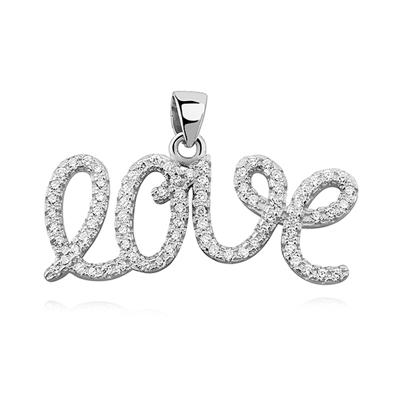 Zawieszka z miłosnym przekazem. Wykonana ze srebra, zdobiona białymi cyrkoniami. Uszlachetniona rodem, by dłużej zachowała jasną barwę, blask i była odporniejsza na uszkodzenia.