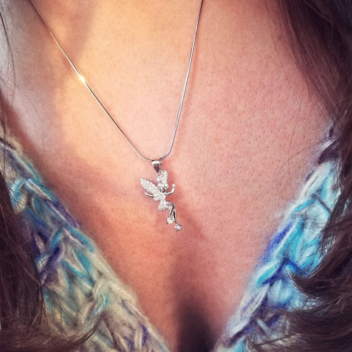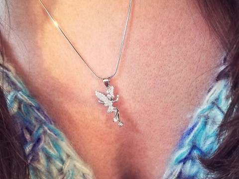 Zawieszka z motywem bajkowej wróżki. Wykonana ze srebra, jednostronnie zdobiona białymi cyrkoniami. Uszlachetniona rodem, by dłużej zachowała jasną barwę, blask i była odporniejsza na uszkodzenia.