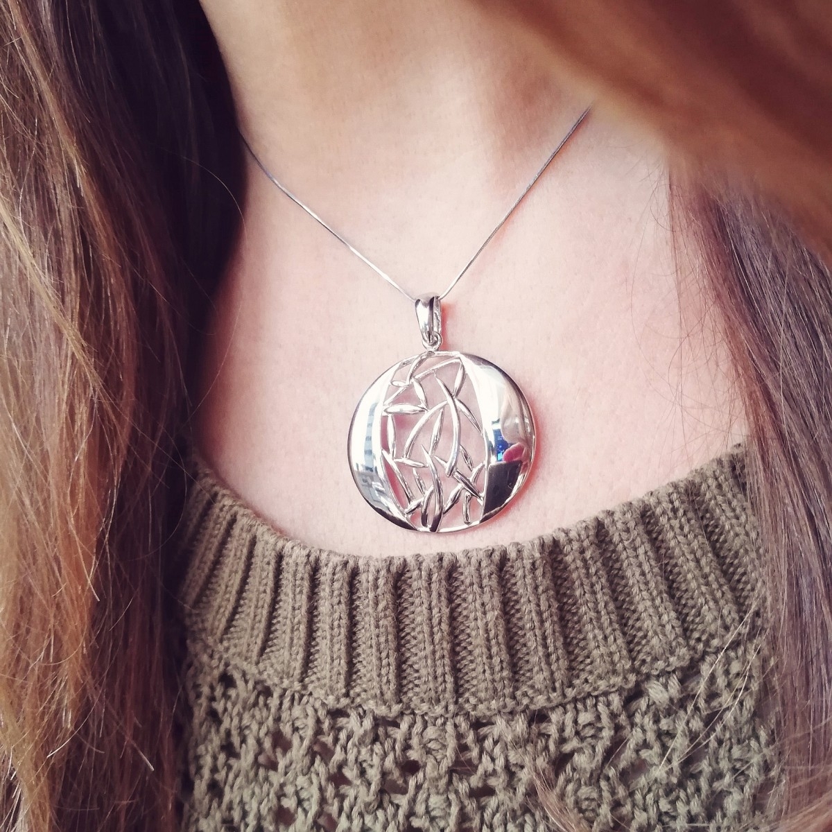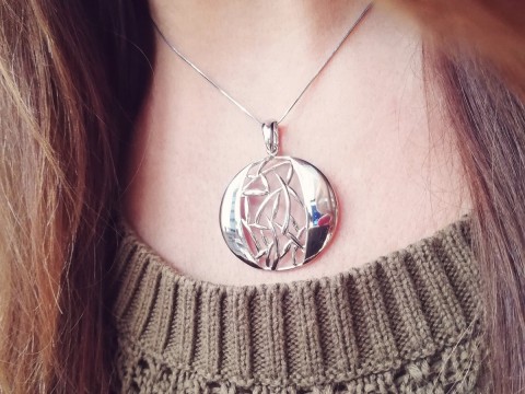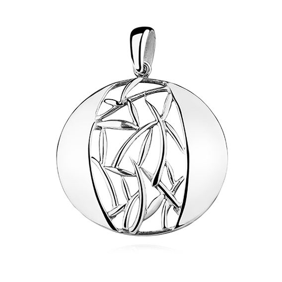 Zawieszka w kształcie dużego koła z ażurowym zdobieniem. Delikatnie wypukła. Wykończona wysokim połyskiem. Uszlachetniona rodem.