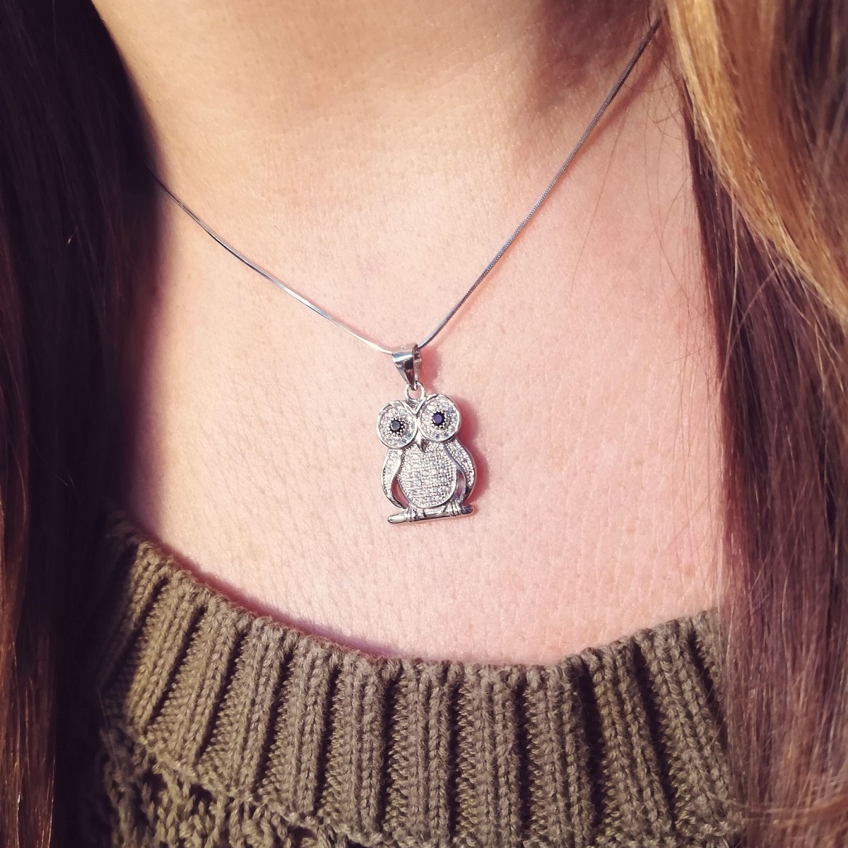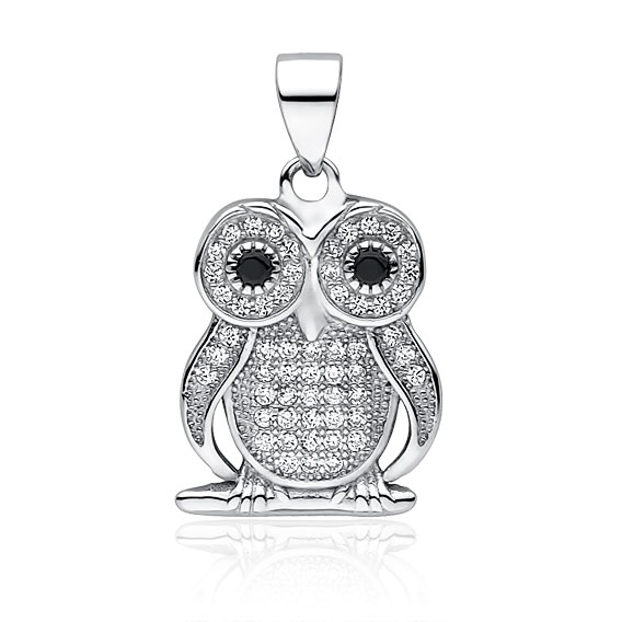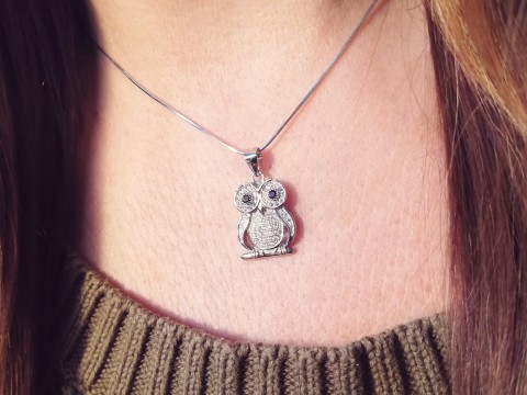 Zawieszka z motywem sowy. Zdobiona białymi i czarnymi cyrkoniami. Uszlachetniona rodem.