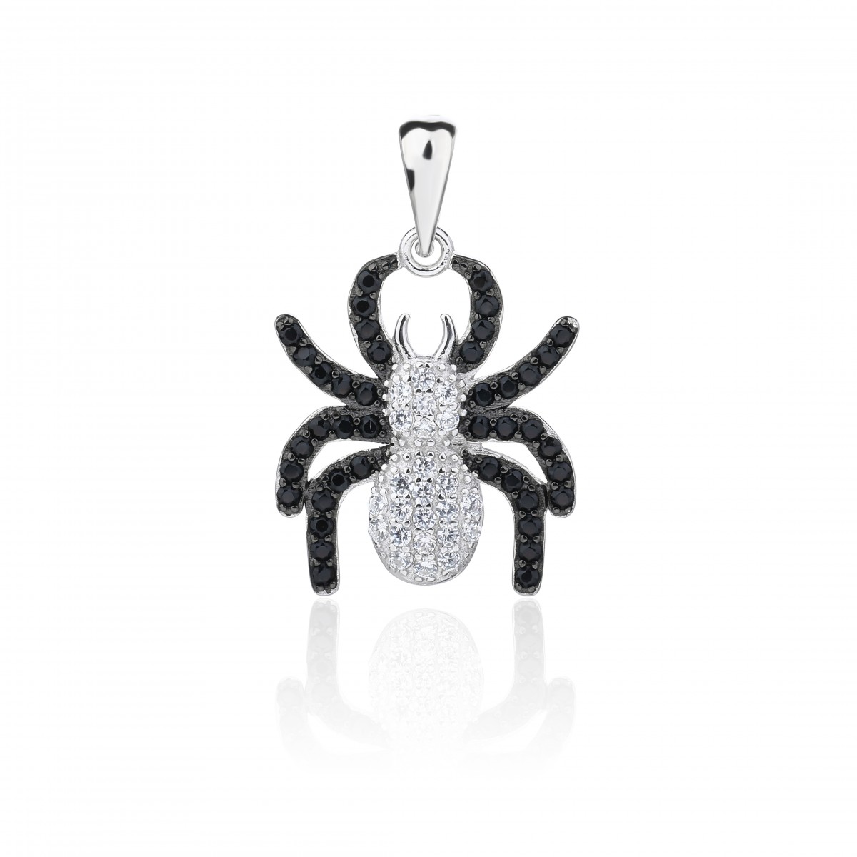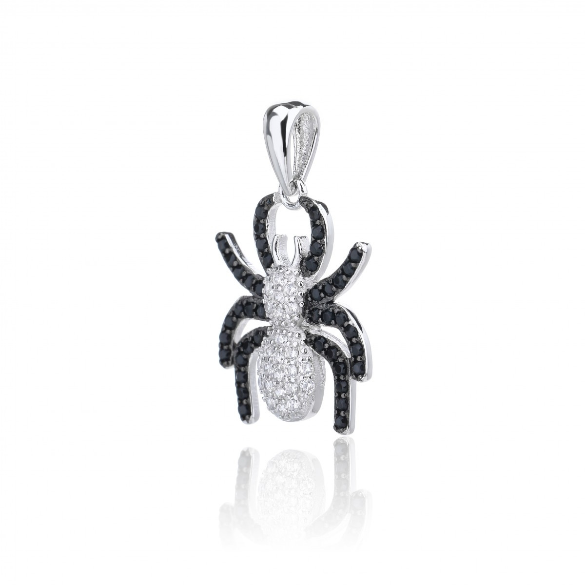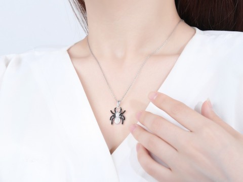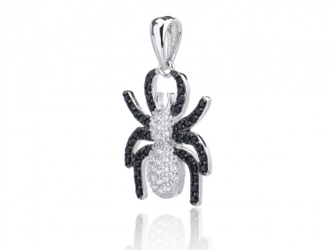 Zawieszka z motywem pająka. Wysadzana cyrkoniami - odnóża czarnymi, a głowotułów białymi kamieniami. Uszlachetniona rodem.