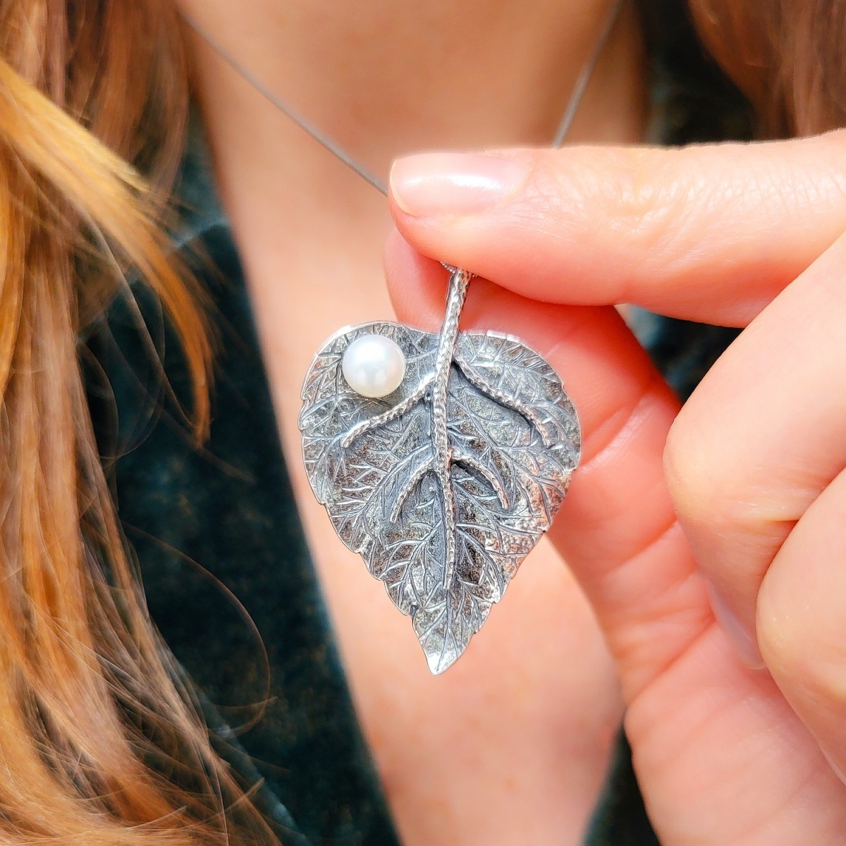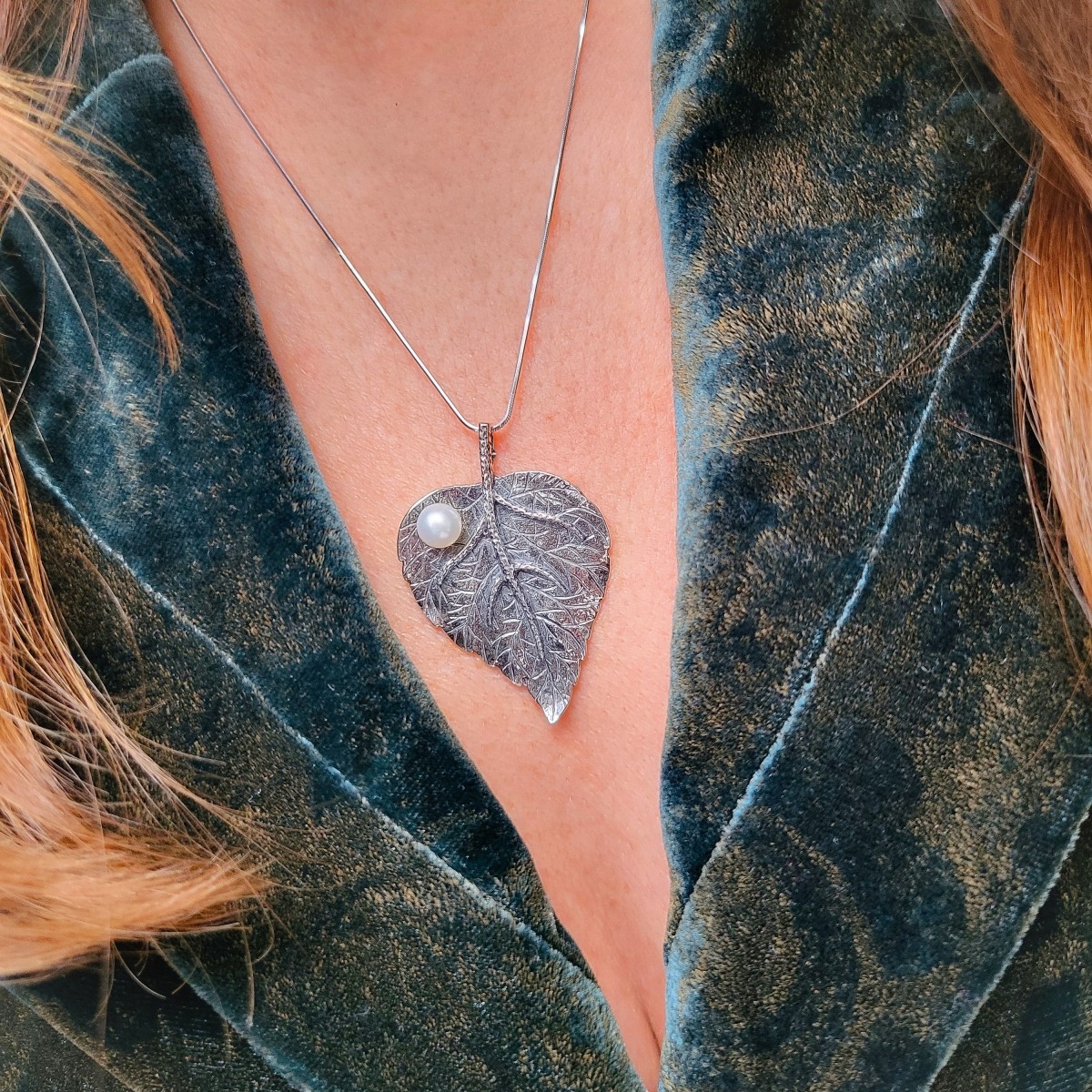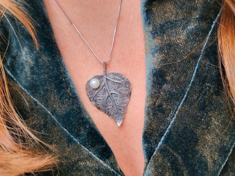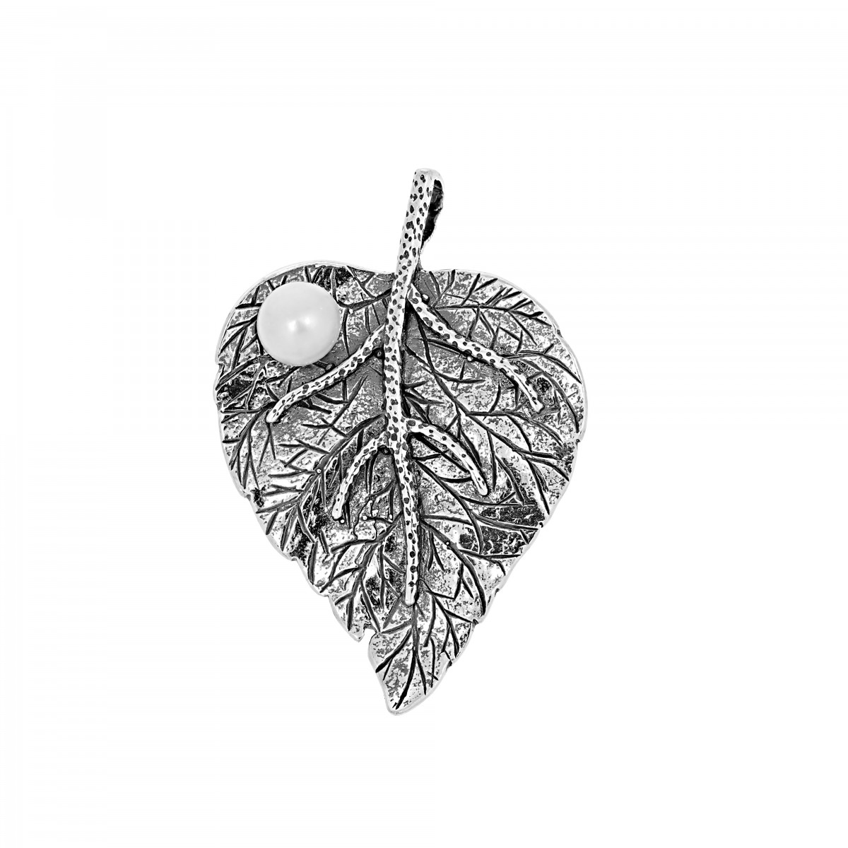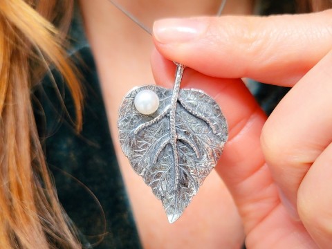 Zawieszka w formie listka zdobionego białą perłą. Wykonana z oksydowanego srebra.